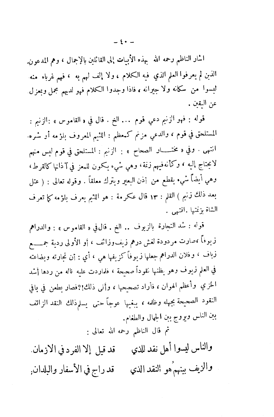 قد قيل إِلَّا الْفَرد فِي الازمان ... والزيف بَينهم هُوَ النَّقْد الَّذِي ... قد راج فِي الْأَسْفَار والبلدان