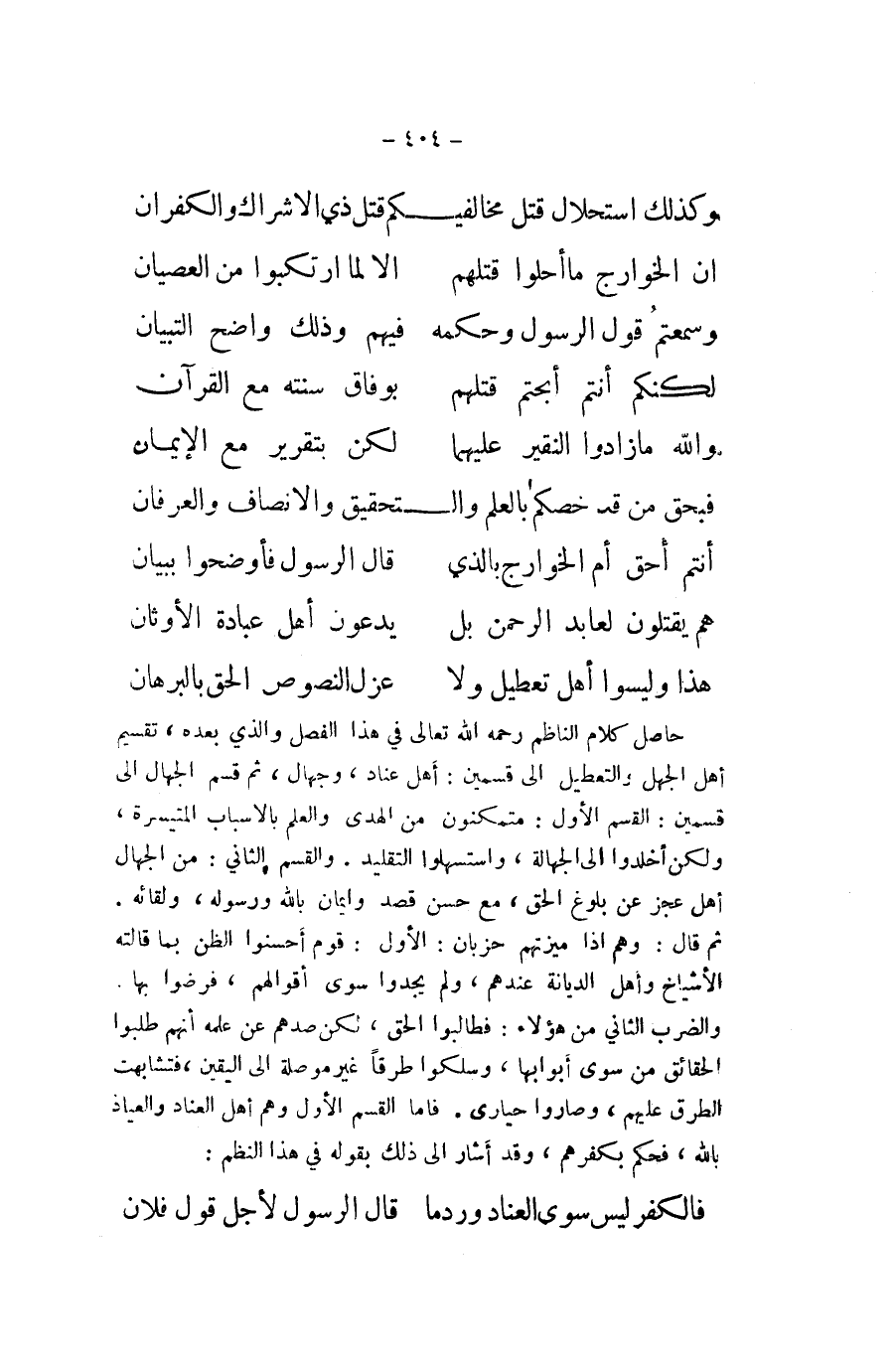 .. وَكَذَلِكَ استحلال قتل مخالفيكم قتل ذِي الاشراك والكفران ... ان الْخَوَارِج مَا احلوا قَتلهمْ ... الا لما ارتكبوا من الْعِصْيَان ... وسمعتم قَول الرَّسُول وَحكمه ... فيهم وَذَلِكَ وَاضح التِّبْيَان