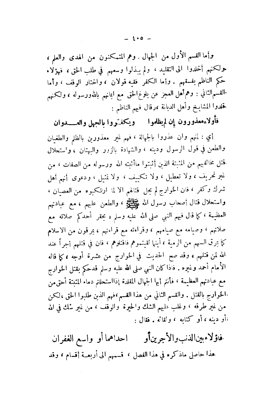 أَي إِنَّهُم وان عذروا بالجهالة فهم غير معذورين بالظلم والطغيان والطعن فِي قَول الرَّسُول وَدينه وَالشَّهَادَة بالزور والبهتان وَاسْتِحْلَال قتل مخاليفهم من المثبتة الَّذين اثبتوا مَا اثبته الله وَرَسُوله من الصِّفَات من غير تَحْرِيف وَلَا تَعْطِيل وَلَا تكييف وَلَا تَمْثِيل وَدَعوى أَنهم اهل شرك وَكفر فان الْخَوَارِج لم يحل قِتَالهمْ الا لما ارتكبوه من الْعِصْيَان وَاسْتِحْلَال قتال اصحاب رَسُول الله صلى الله عَلَيْهِ وَسلم والطعن عَلَيْهِم مَعَ عِبَادَتهم الْعَظِيمَة كَمَا قَالَ فيهم النَّبِي صلى الله عَلَيْهِ وَسلم يحقر أحدكُم صلَاته مَعَ صلَاتهم وصيامه مَعَ صِيَامهمْ وقراءته مَعَ قراءتهم يَمْرُقُونَ من الاسلام كَمَا يَمْرُق السهْم من الرَّمية أَيْنَمَا لقيتموهم فاقتلوهم فان فِي قَتلهمْ أجرا عِنْد الله لمن قَتلهمْ وَقد صَحَّ الحَدِيث فِي الْخَوَارِج من عشرَة اوجه كَمَا قَالَه الامام احْمَد وَغَيره فاذا كَانَ النَّبِي صلى الله عَلَيْهِ وَسلم قد حكم بقتل الْخَوَارِج مَعَ عِبَادَتهم الْعَظِيمَة فَأنْتم أَيهَا الْجُهَّال المقلدة إِذا استحللتم دِمَاء المثبتة أَحَق من الْخَوَارِج بِالْقَتْلِ وَالْقسم الثَّانِي من هَذَا الْقسم فهم الَّذين طلبُوا الْحق لَكِن من غير طرقه وَغلب عَلَيْهِم الشَّك والحيرة وَالْوَقْف من غير شكّ فِي الله أَو دينه أَو كِتَابه ولقائه فَقَالَ ... فاؤلاء بَين الذَّنب والأجرين أَو ... احداهما أَو وَاسع الغفران ...