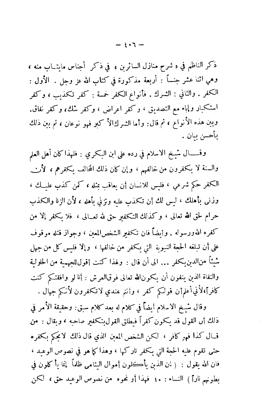 وَقَالَ شيخ الاسلام أَيْضا فِي كَلَام لَهُ بعد كَلَام سبق وَحَقِيقَة الْأَمر فِي ذَلِك أَن القَوْل قد يكون كفرا فيطلق القَوْل بتكفير صَاحبه وَيُقَال من قَالَ كَذَا فَهُوَ كَافِر لَكِن الشَّخْص الْمعِين الَّذِي قَالَ ذَلِك لَا يحكم بِكُفْرِهِ حَتَّى تقوم عَلَيْهِ الْحجَّة الَّتِي يكفر تاركها وَهَذَا كَمَا هُوَ فِي نُصُوص الْوَعيد فان الله يَقُول {إِن الَّذين يَأْكُلُون أَمْوَال الْيَتَامَى ظلما إِنَّمَا يَأْكُلُون فِي بطونهم نَارا} النِّسَاء فَهَذَا أَو نَحوه من نُصُوص الْوَعيد حق لَكِن