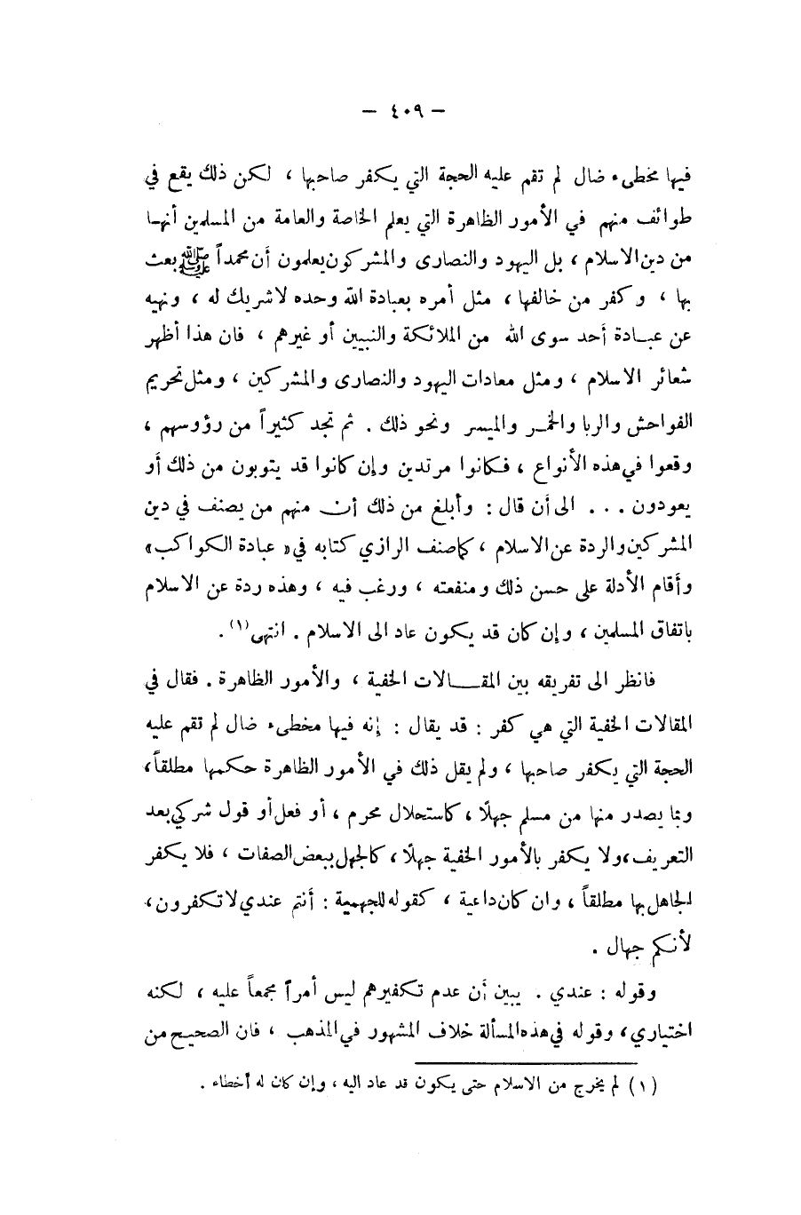 فَانْظُر الى تفريقه بَين المقالات الْخفية والأمور الظَّاهِرَة فَقَالَ فِي المقالات الْخفية الَّتِي هِيَ كفر قد يُقَال إِنَّه فِيهَا مخطيء ضال لم تقم عَلَيْهِ الْحجَّة الَّتِي يكفر صَاحبهَا وَلم يقل ذَلِك فِي الْأُمُور الظَّاهِرَة حكمهَا مُطلقًا وَبِمَا يصدر مِنْهَا من مُسلم جهلا كاستحلال محرم أَو فعل أَو قَول شركي بعد التَّعْرِيف وَلَا يكفر بالأمور الْخفية جهلا كالجهل بِبَعْض الصِّفَات فَلَا يكفر الْجَاهِل بهَا مُطلقًا وان كَانَ دَاعِيَة كَقَوْلِه للجهمية أَنْتُم عِنْدِي لَا تكفرون لأنكم جهال
