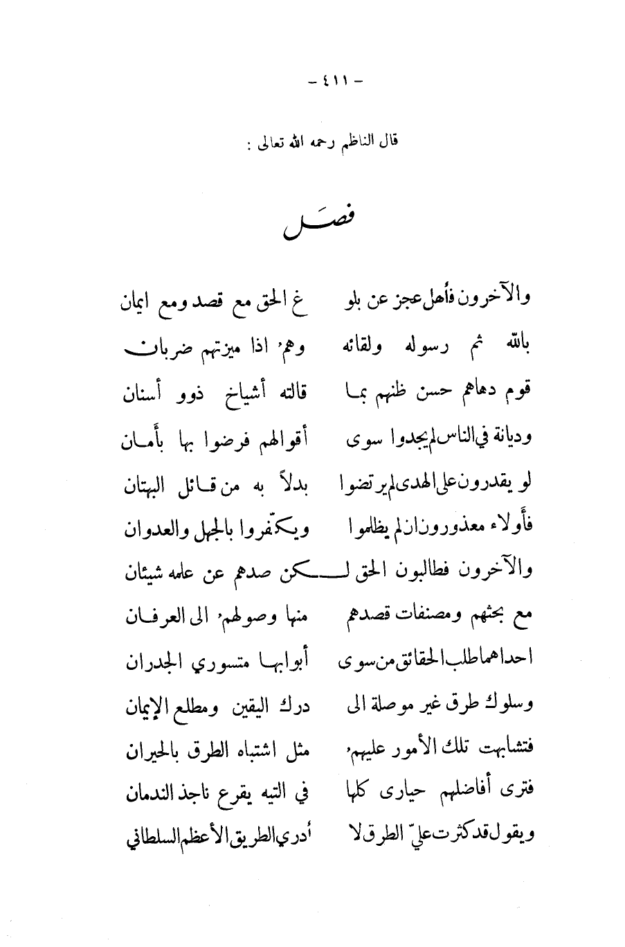 فصل ... وَالْآخرُونَ فَأهل عجز عَن بلو ... غ الْحق مَعَ قصد وَمَعَ ايمان ... بِاللَّه ثمَّ رَسُوله ولقائه ... وهم اذا ميزتهم ضَرْبَان ... قوم دهاهم حسن ظنهم بِمَا ... قالته اشياخ ذَوُو أَسْنَان
