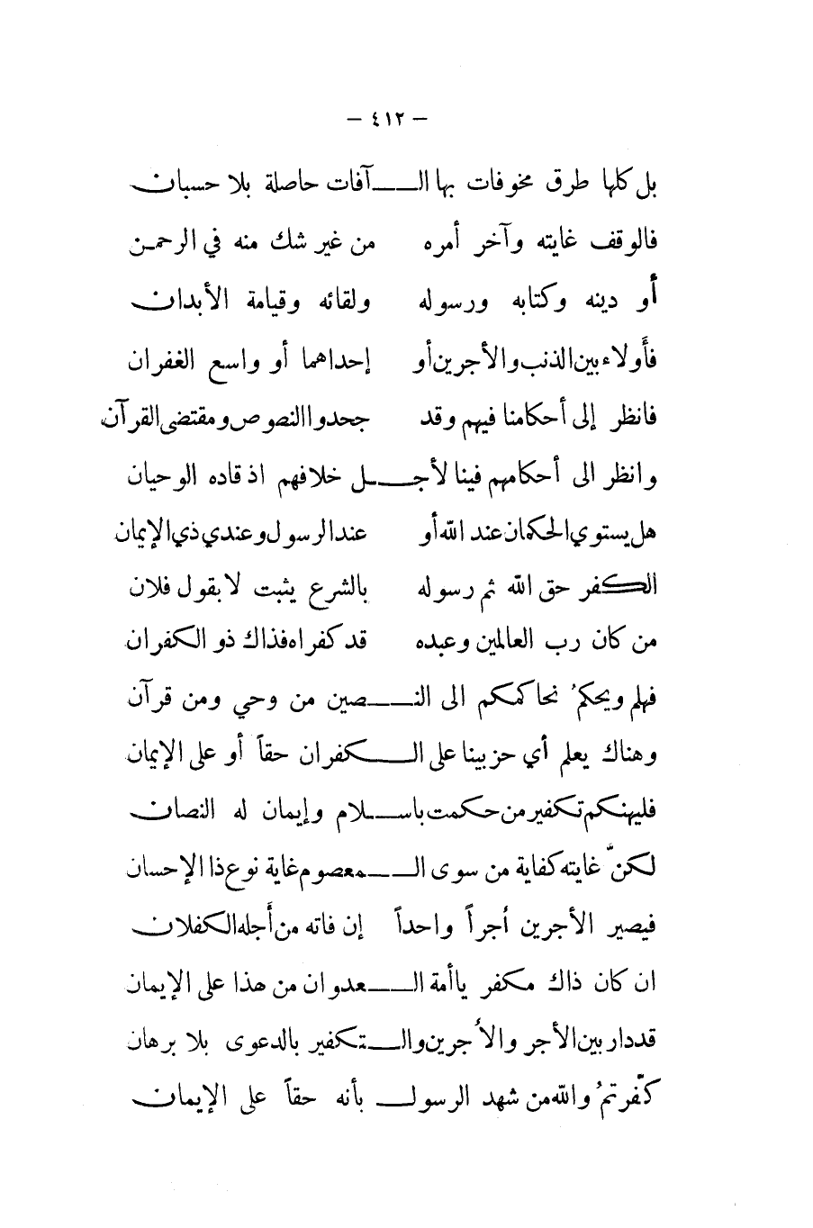 ان كَانَ ذَاك مكفر يَا أمة الْعدوان من هَذَا على الْإِيمَان ... قد دَار بَين الْأجر والأجرين والتكفير بِالدَّعْوَى بِلَا برهَان ... كَفرْتُمْ وَالله من شهد الرَّسُول بِأَنَّهُ حَقًا على الْإِيمَان ...