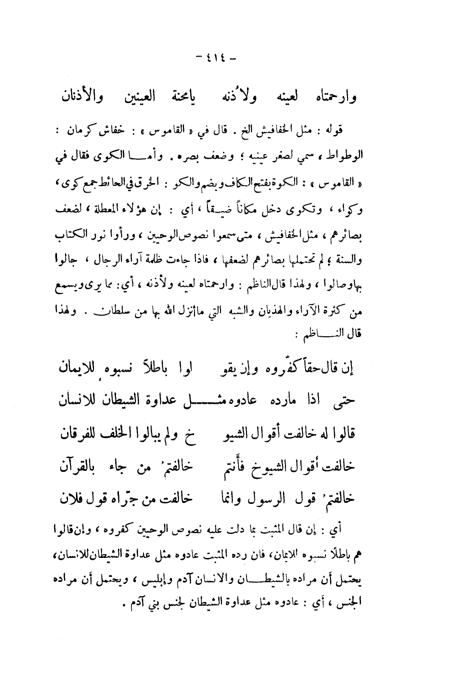 قَوْله مثل الخفافيش الخ قَالَ فِي الْقَامُوس خفاش كرمان الوطواط سمي لصِغَر عَيْنَيْهِ وَضعف بَصَره وَأما الكوى فَقَالَ فِي الْقَامُوس الكوة بِفَتْح الْكَاف وَيضم والكو الْخرق فِي الْحَائِط جمع كوى وكواء وتكوى دخل مَكَانا ضيقا أَي إِن هَؤُلَاءِ المعطلة لضعف بصائرهم مثل الخفافيش مَتى سمعُوا نُصُوص الوحيين وَرَأَوا نور الْكتاب وَالسّنة لم تحتملها بصائرهم لِضعْفِهَا فاذا جَاءَت ظلمَة آراء الرِّجَال جالوا بهَا وصالوا وَلِهَذَا قَالَ النَّاظِم وارحمتاه لعَينه ولأذنه أَي مِمَّا يرى وَيسمع من كَثْرَة الآراء والهذيان والشبه الَّتِي مَا أنزل الله بهَا من سُلْطَان وَلِهَذَا قَالَ النَّاظِم ... إِن قَالَ حَقًا كفروه وَإِن يقو ... لوا بَاطِلا نسبوه للايمان ... حَتَّى اذا مارده عادوه مثل عَدَاوَة الشَّيْطَان للانسان