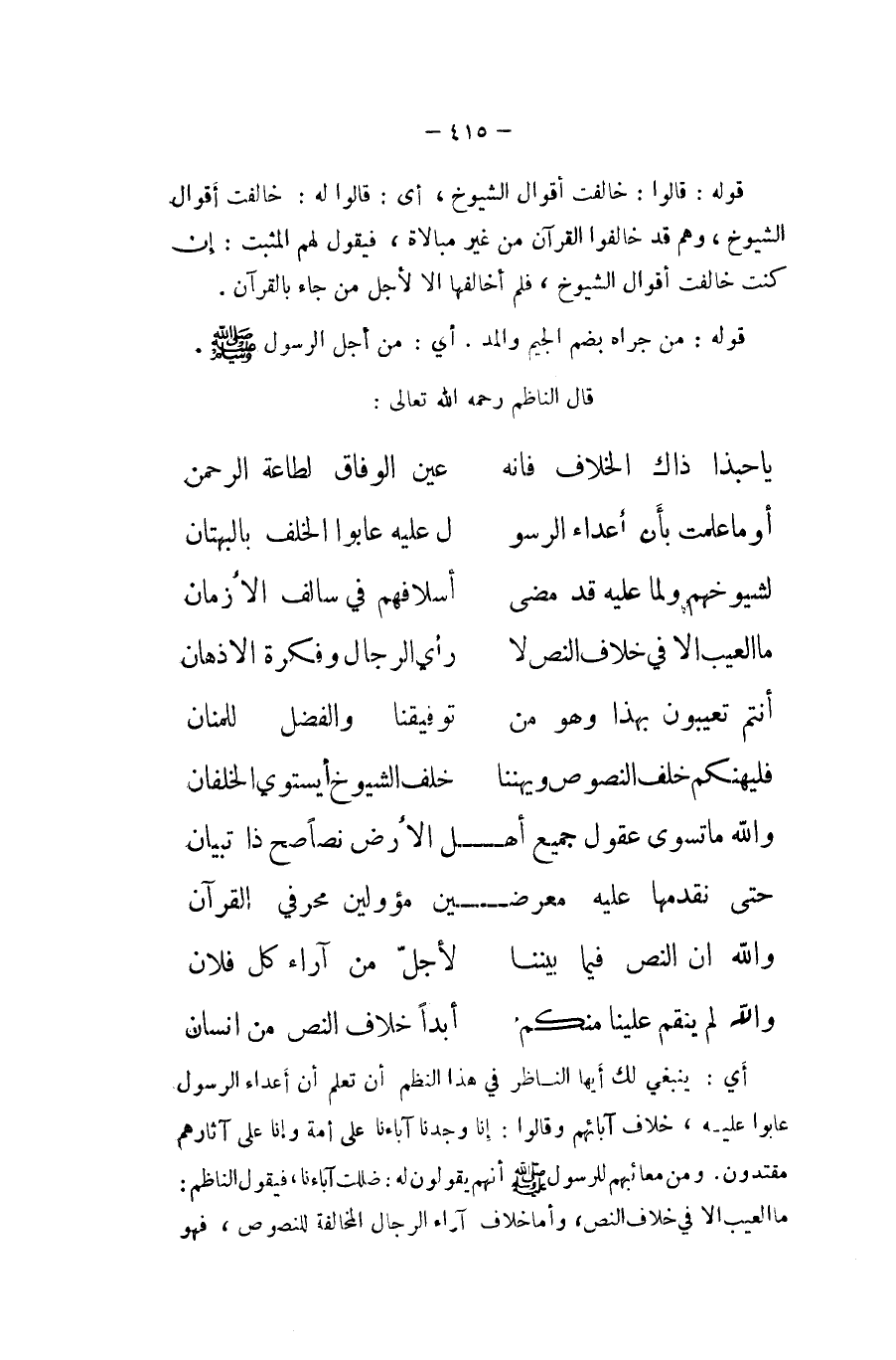 أَي يَنْبَغِي لَك أَيهَا النَّاظر فِي هَذَا النّظم أَن تعلم أَن أَعدَاء الرَّسُول عابوا عَلَيْهِ خلاف آبَائِهِم وَقَالُوا إِنَّا وجدنَا آبَائِنَا على امة وَإِنَّا على آثَارهم مقتدون وَمن معائبهم للرسول صلى الله عَلَيْهِ وَسلم أَنهم يَقُولُونَ لَهُ ضللت آبَاءَنَا فَيَقُول النَّاظِم مَا الْعَيْب الا فِي خلاف النَّص وَأما خلاف آراء الرِّجَال الْمُخَالفَة للنصوص فَهُوَ