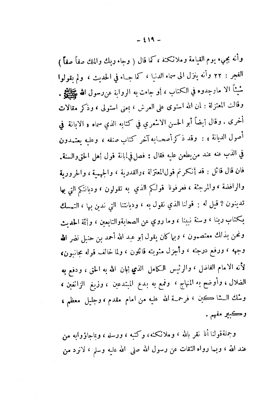 وَأَنه يَجِيء يَوْم الْقِيَامَة وَمَلَائِكَته كَمَا قَالَ {وَجَاء رَبك وَالْملك صفا صفا} الْفجْر وَأَنه ينزل الى سَمَاء الدُّنْيَا كَمَا جَاءَ فِي الحَدِيث وَلم يَقُولُوا شَيْئا الا مَا وجدوه فِي الْكتاب أَو جَاءَت بِهِ الرِّوَايَة عَن رَسُول الله صلى الله عَلَيْهِ وَسلم وَقَالَت الْمُعْتَزلَة إِن الله اسْتَوَى على الْعَرْش بِمَعْنى استولى وَذكر مقالات أُخْرَى وَقَالَ أَيْضا أَبُو الْحسن الْأَشْعَرِيّ فِي كِتَابه الَّذِي سَمَّاهُ الابانه فِي أصُول الدّيانَة وَقد ذكر أَصْحَابه آخر كتاب صنفه وَعَلِيهِ يعتمدون فِي الذب عَنهُ عِنْد من يطعن عَلَيْهِ فَقَالَ فصل فِي إبانة قَول اهل الْحق وَالسّنة فان قَالَ قَائِل قد أنكرتم قَول الْمُعْتَزلَة والقدرية والجهمية والحرورية والرافضة والمرجئة فعرفونا قَوْلكُم الَّذِي بِهِ تَقولُونَ وديانتكم الَّتِي بهَا تدينون قيل لَهُ قَوْلنَا الَّذِي نقُول بِهِ وديانتنا الَّتِي ندين بهَا التَّمَسُّك بِكِتَاب رَبنَا وَسنة نَبينَا وَمَا رُوِيَ عَن الصَّحَابَة وَالتَّابِعِينَ وأئمة الحَدِيث وَنحن بذلك معتصمون وَبِمَا كَانَ يَقُول أَبُو عبد الله أَحْمد بن حَنْبَل نصر الله وَجهه وَرفع دَرَجَته وأجزل مثوبته قَائِلُونَ وَلما خَالف قَوْله مجانبون لِأَنَّهُ الامام الْفَاضِل والرئيس الْكَامِل الَّذِي أبان الله بِهِ الْحق وَدفع بِهِ الضلال وأوضح بِهِ الْمِنْهَاج وقمع بِهِ بدع المبتدعين وزيغ الزائغين وَشك الشاكين فرحمة الله عَلَيْهِ من امام مقدم وجليل مُعظم وكبير مفهم