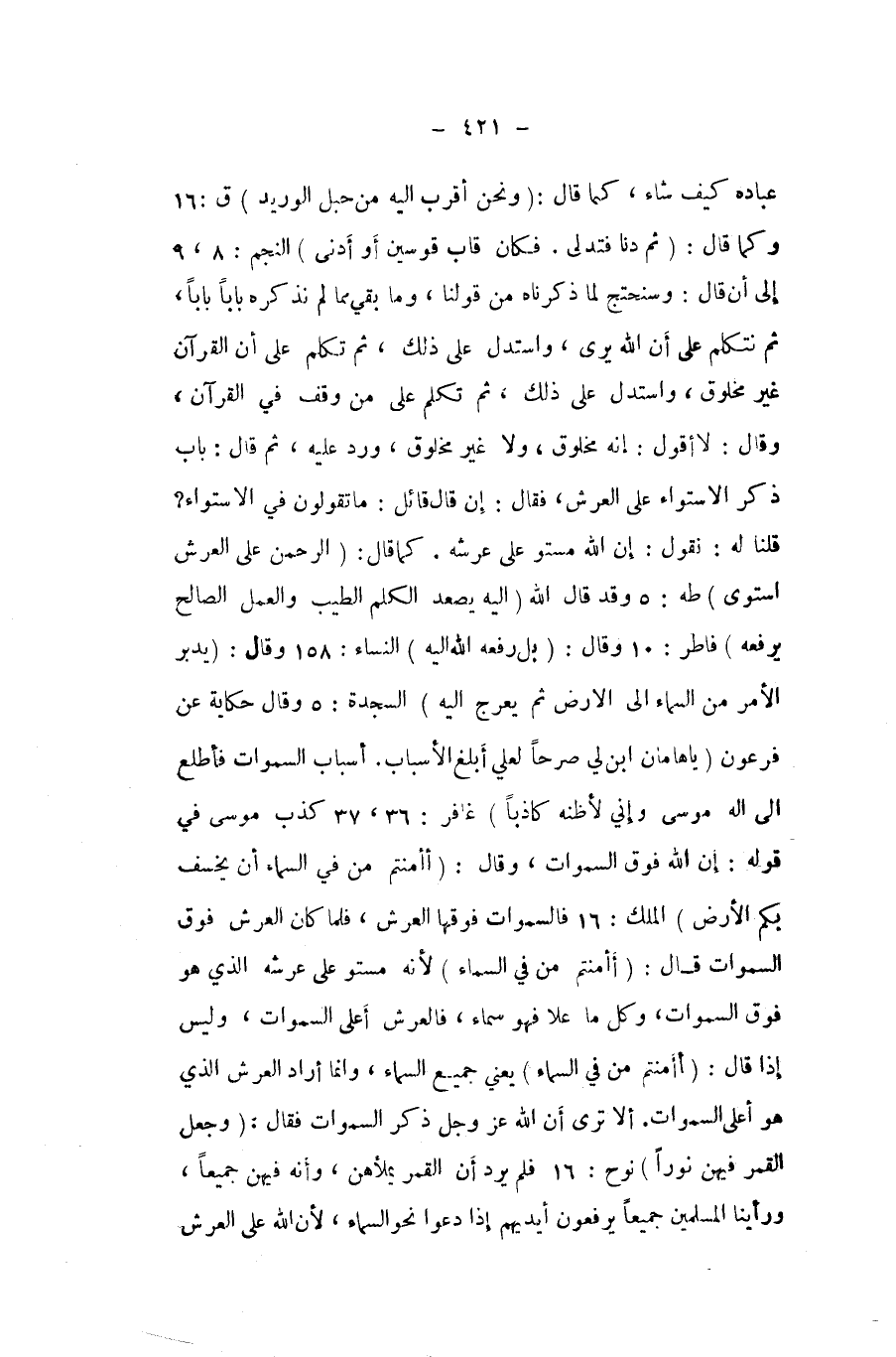 عباده كَيفَ شَاءَ كَمَا قَالَ {وَنحن أقرب إِلَيْهِ من حَبل الوريد} ق وكما قَالَ {ثمَّ دنا فَتَدَلَّى فَكَانَ قاب قوسين أَو أدنى} النَّجْم إِلَى أَن قَالَ وسنحتج لما ذَكرْنَاهُ من قَوْلنَا وَمَا بَقِي مِمَّا لم نذكرهُ بَابا بَابا ثمَّ نتكلم على أَن الله يرى وَاسْتدلَّ على ذَلِك ثمَّ تكلم على أَن الْقُرْآن غير مَخْلُوق وَاسْتدلَّ على ذَلِك ثمَّ تكلم على من وقف فِي الْقُرْآن وَقَالَ لَا أَقُول إِنَّه مَخْلُوق وَلَا غير مَخْلُوق ورد عَلَيْهِ ثمَّ قَالَ بَاب ذكر الاسْتوَاء على الْعَرْش فَقَالَ إِن قَالَ قَائِل مَا تَقولُونَ فِي الاسْتوَاء قُلْنَا لَهُ نقُول إِن الله مستو على عَرْشه كَمَا قَالَ {الرَّحْمَن على الْعَرْش اسْتَوَى} طه وَقد قَالَ الله {إِلَيْهِ يصعد الْكَلم الطّيب وَالْعَمَل الصَّالح يرفعهُ} فاطر وَقَالَ {بل رَفعه الله إِلَيْهِ} النِّسَاء وَقَالَ {يدبر الْأَمر من السَّمَاء إِلَى الأَرْض ثمَّ يعرج إِلَيْهِ} السَّجْدَة وَقَالَ حِكَايَة عَن فِرْعَوْن {يَا هامان ابْن لي صرحا لعَلي أبلغ الْأَسْبَاب أَسبَاب السَّمَاوَات فَأطلع إِلَى إِلَه مُوسَى وَإِنِّي لأظنه كَاذِبًا} غَافِر كذب مُوسَى فِي قَوْله إِن الله فَوق السَّمَاوَات وَقَالَ {أأمنتم من فِي السَّمَاء أَن يخسف بكم الأَرْض} الْملك فالسماوات فَوْقهَا الْعَرْش فَلَمَّا كَانَ الْعَرْش فَوق السَّمَاوَات قَالَ {أأمنتم من فِي السَّمَاء} لِأَنَّهُ مستو على عَرْشه الَّذِي هُوَ فَوق السَّمَاوَات وكل مَا علا فَهُوَ سَمَاء فالعرش أَعلَى السَّمَاوَات وَلَيْسَ إِذا قَالَ {أأمنتم من فِي السَّمَاء} يَعْنِي جَمِيع السَّمَاء وانما أَرَادَ الْعَرْش الَّذِي هُوَ أَعلَى السَّمَاوَات أَلا ترى أَن الله عز وَجل ذكر السَّمَاوَات فَقَالَ {وَجعل الْقَمَر فِيهِنَّ نورا} نوح فَلم يرد أَن الْقَمَر يملأهن وَأَنه فِيهِنَّ جَمِيعًا ورأينا الْمُسلمين جَمِيعًا يرفعون أَيْديهم إِذا دعوا نَحْو السَّمَاء لِأَن الله على الْعَرْش
