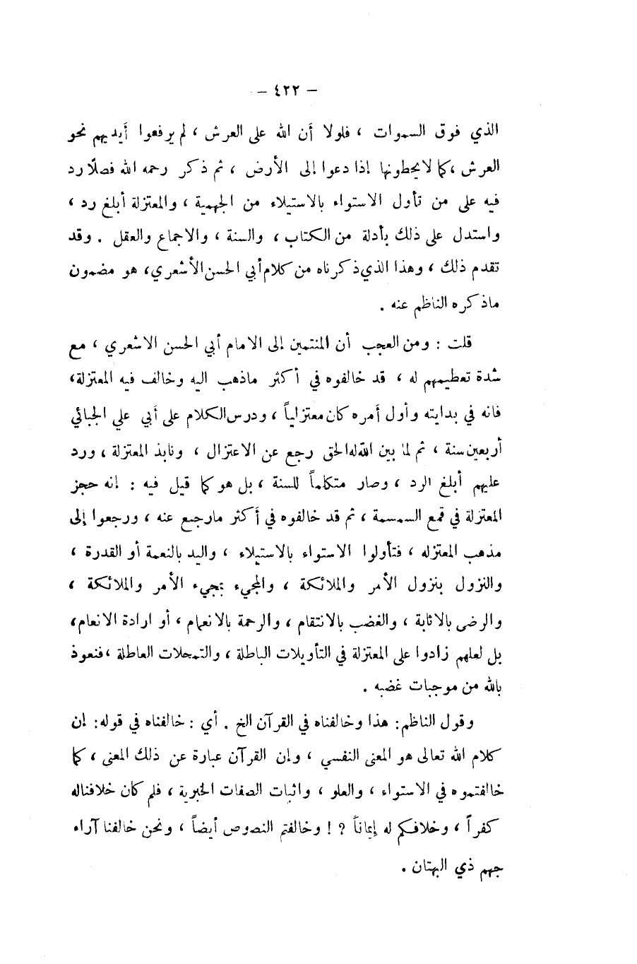 قلت وَمن الْعجب أَن المنتمين إِلَى الامام أبي الْحسن الاشعري مَعَ شدَّة تعظيمهم لَهُ قد خالفوه فِي أَكثر مَا ذهب إِلَيْهِ وَخَالف فِيهِ الْمُعْتَزلَة فانه فِي بدايته وَأول أمره كَانَ مُعْتَزِلا ودرس الْكَلَام على أبي عَليّ الجبائي أَرْبَعِينَ سنة ثمَّ لما بَين الله لَهُ الْحق رَجَعَ عَن الاعتزال ونابذ الْمُعْتَزلَة ورد عَلَيْهِم أبلغ الرَّد وَصَارَ متكلما للسّنة بل هُوَ كَمَا قيل فِيهِ إِنَّه حجز الْمُعْتَزلَة فِي قمع السمسمة ثمَّ قد خالفوه فِي أَكثر مَا رَجَعَ عَنهُ وَرَجَعُوا إِلَى مَذْهَب الْمُعْتَزلَة فتأولوا الاسْتوَاء بِالِاسْتِيلَاءِ وَالْيَد بِالنعْمَةِ أَو الْقُدْرَة وَالنُّزُول بنزول الْأَمر وَالْمَلَائِكَة والمجيء بمجيء الْأَمر وَالْمَلَائِكَة والرضى بالاثابة وَالْغَضَب بالانتقام وَالرَّحْمَة بالانعام أَو ارادة الانعام بل لَعَلَّهُم زادوا على الْمُعْتَزلَة فِي التأويلات الْبَاطِلَة والتمحلات العاطلة فنعوذ بِاللَّه من مُوجبَات غَضَبه