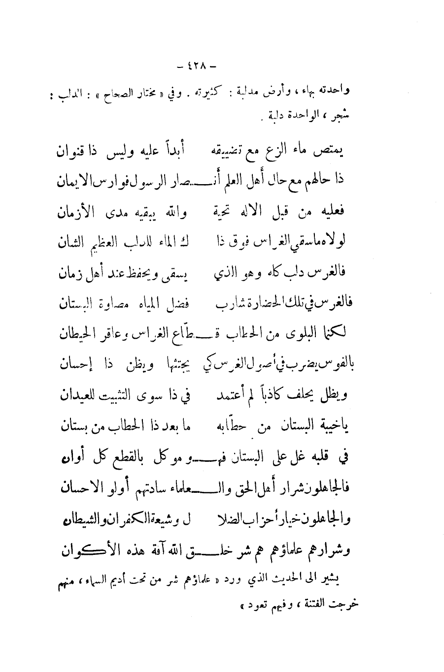 ذَا حَالهم مَعَ حَال أهل الْعلم أنصار الرَّسُول فوارس الايمان ... فَعَلَيهِ من قبل الاله تَحِيَّة ... وَالله يبقيه مدى الْأَزْمَان ... لولاه مَا سقِِي الْغِرَاس فَوق ذَا ... ك المَاء للدلب الْعَظِيم الشان