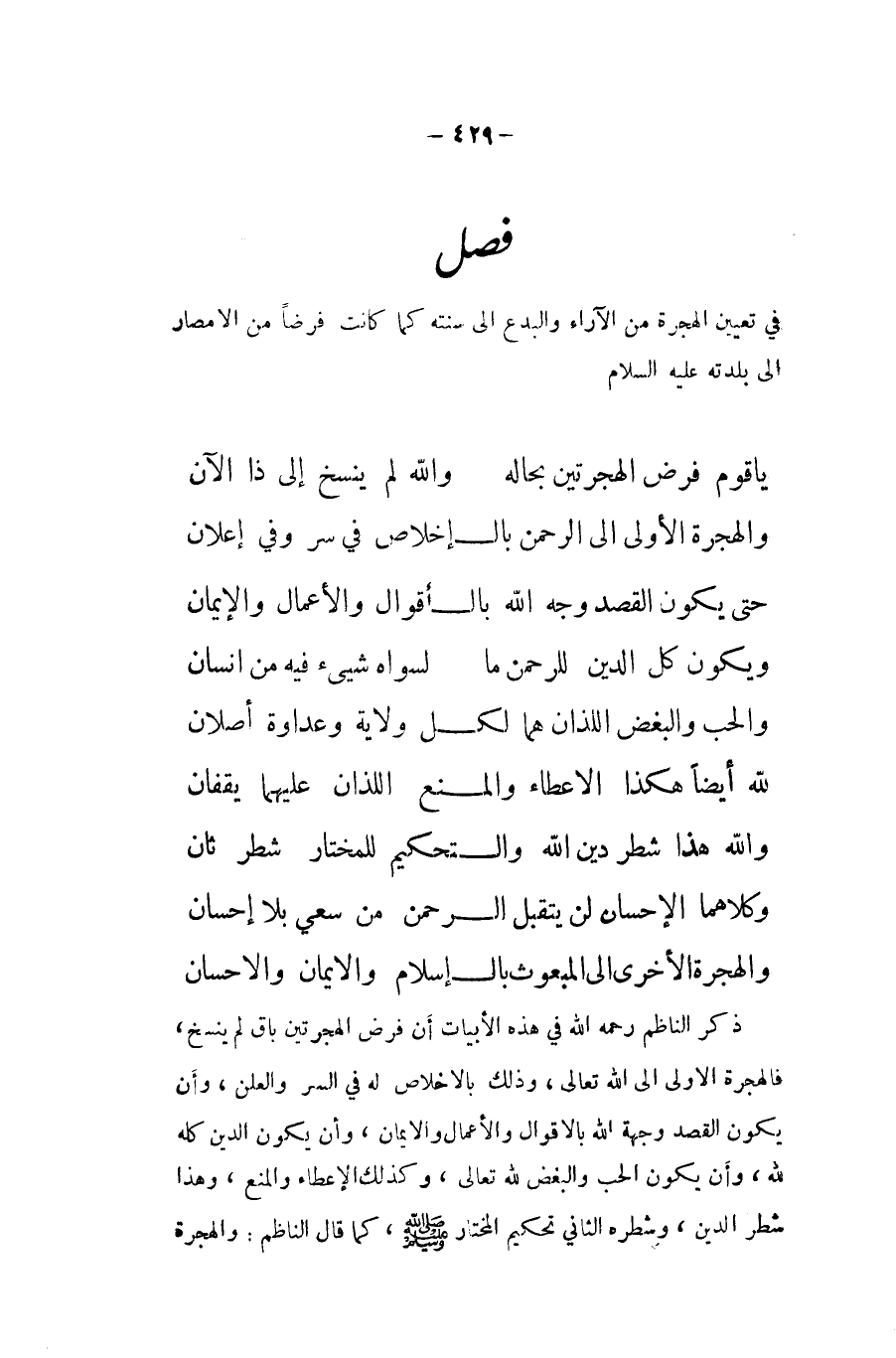 فِي تعْيين الْهِجْرَة من الآراء والبدع الى سنته كَمَا كَانَت فرضا من الامصار الى بلدته عَلَيْهِ السَّلَام ... يَا قوم فرض الهجرتين بِحَالهِ ... وَالله لم ينْسَخ إِلَى ذَا الْآن ... وَالْهجْرَة الأولى الى الرَّحْمَن بالإخلاص إخلاص فِي سر وَفِي إعلان