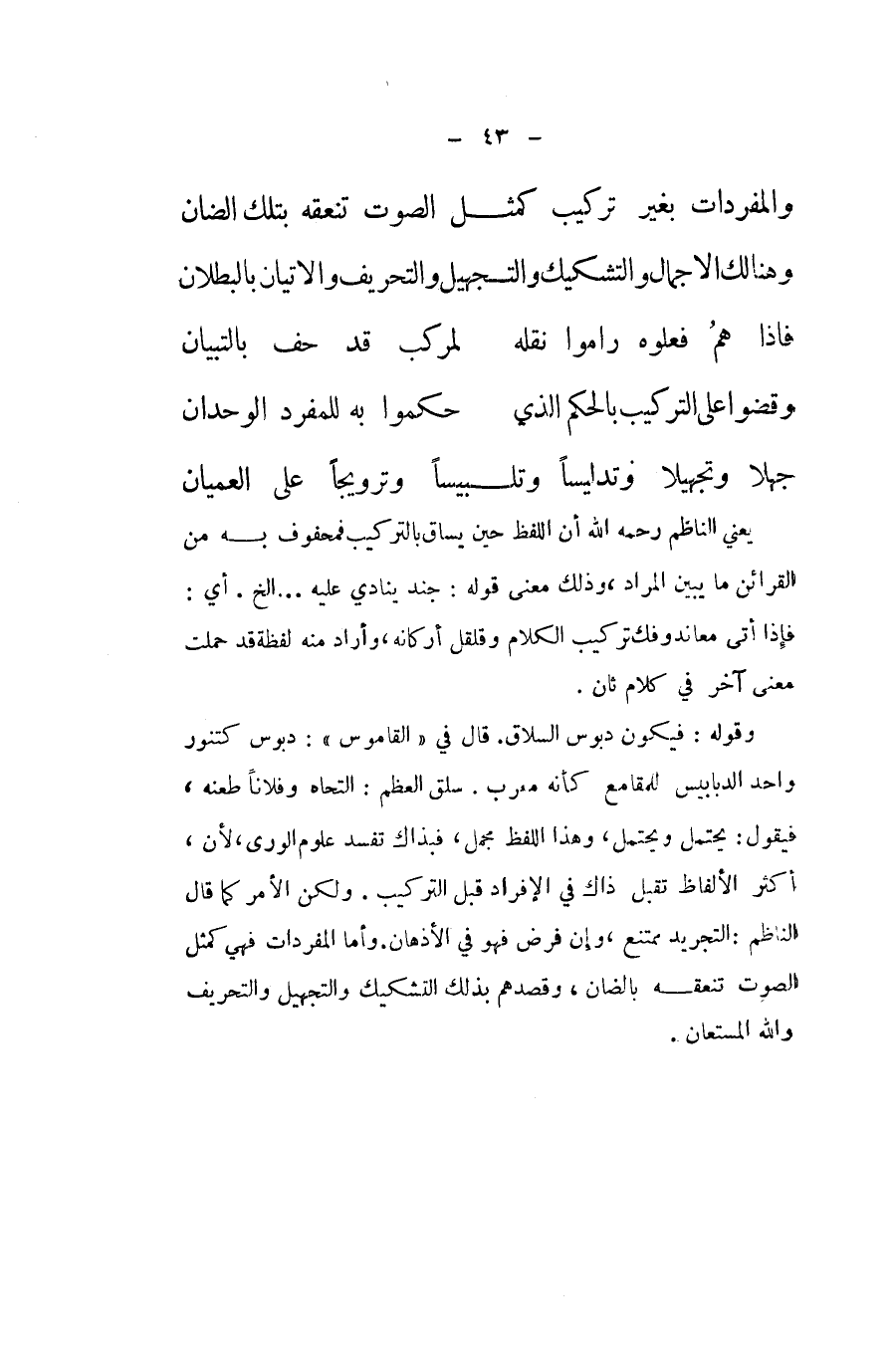 وَقَوله فَيكون دبوس السلاق قَالَ فِي الْقَامُوس دبوس كتنور وَاحِد الدبابيس للمقامع كَأَنَّهُ مُعرب سلق الْعظم التحاه وَفُلَانًا طعنه فَيَقُول يحْتَمل وَيحْتَمل وَهَذَا اللَّفْظ مُجمل فبذاك تفْسد عُلُوم الورى لِأَن أَكثر الْأَلْفَاظ تقبل ذَاك فِي الْإِفْرَاد قبل التَّرْكِيب وَلَكِن الْأَمر كَمَا قَالَ النَّاظِم التَّجْرِيد مُمْتَنع وَإِن فرض فَهُوَ فِي الأذهان وَأما الْمُفْردَات فَهِيَ كَمثل الصَّوْت تنعقه بالضان وقصدهم بذلك التشكيك والتجهيل والتحريف وَالله الْمُسْتَعَان