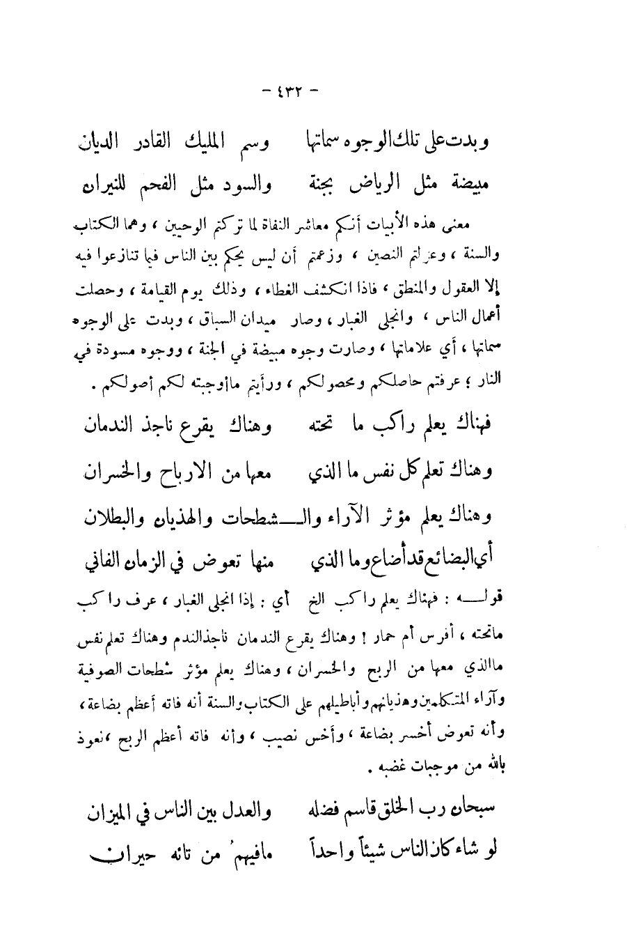 وَهُنَاكَ يعلم مُؤثر الآراء والشطحات والهذيان والبطلان ... أَي البضائع قد أضاع وَمَا الَّذِي ... مِنْهَا تعوض فِي الزَّمَان الفاني ...