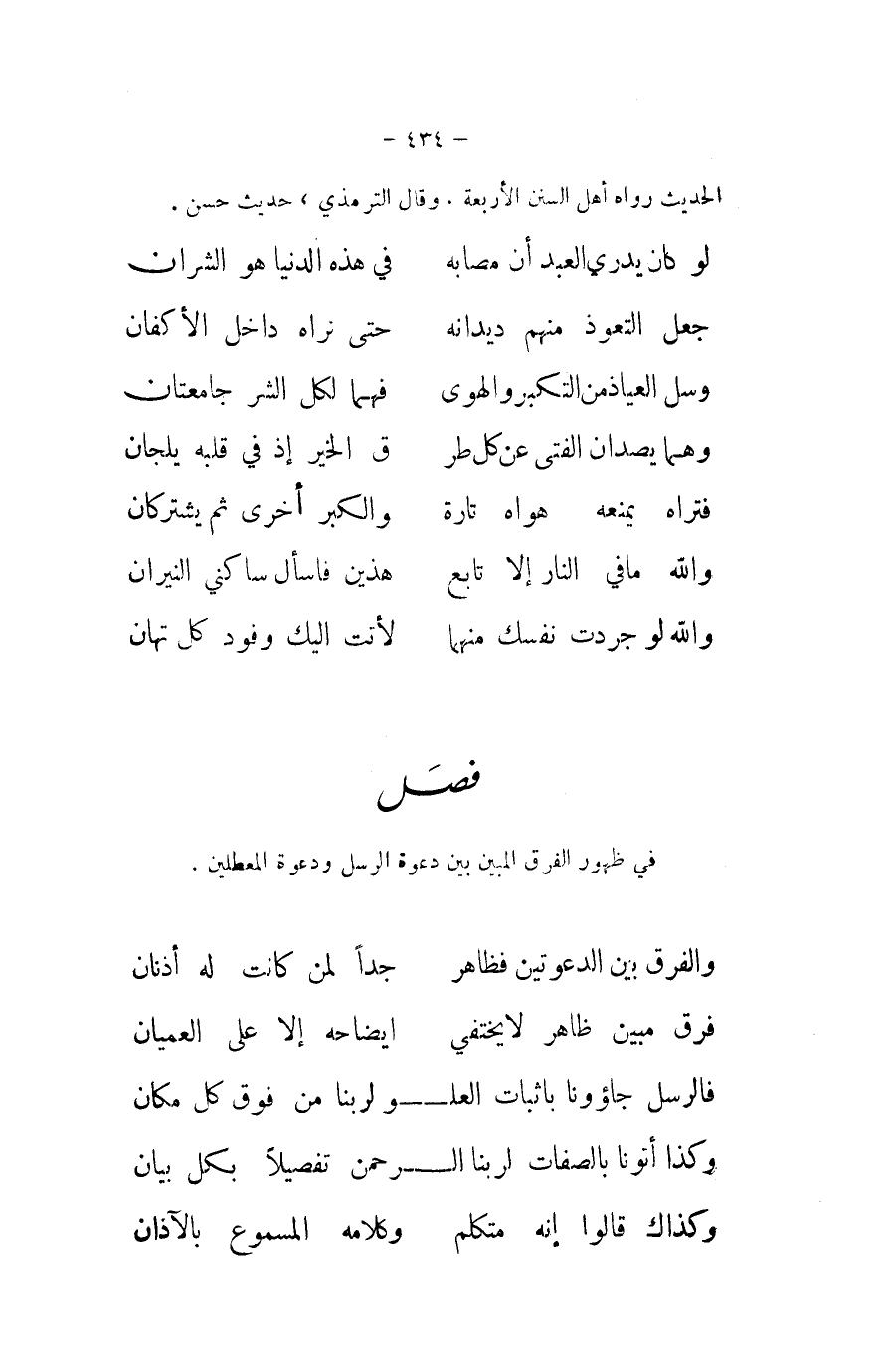 فالرسل جاؤونا باثبات العل ولربنا من فَوق كل مَكَان ... وَكَذَا أتونا بِالصِّفَاتِ لربنا الر حمن لربنا الرَّحْمَن تَفْصِيلًا بِكُل بَيَان