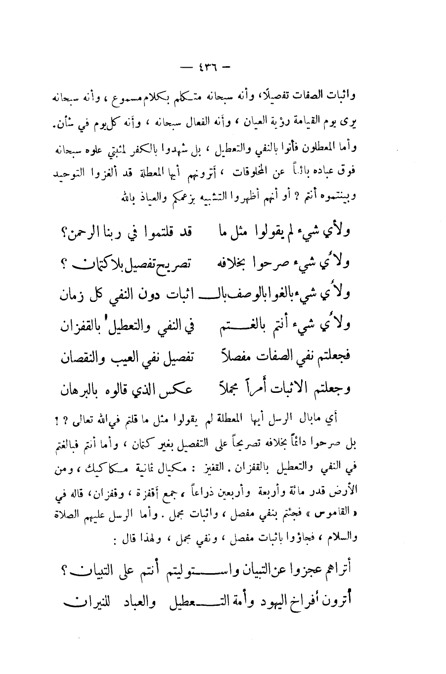 واثبات الصِّفَات تَفْصِيلًا وَأَنه سُبْحَانَهُ مُتَكَلم بِكَلَام مسموع وَأَنه سُبْحَانَهُ يرى يَوْم الْقِيَامَة رُؤْيَة العيان وَأَنه الفعال سُبْحَانَهُ وَأَنه كل يَوْم فِي شَأْن وَأما المعطلون فَأتوا بِالنَّفْيِ والتعطيل بل شهدُوا بالْكفْر لمثبتي علوه سُبْحَانَهُ فَوق عباده بَائِنا عَن الْمَخْلُوقَات أترونهم أَيهَا المعطلة قد ألغزوا التَّوْحِيد وبينتموه أَنْتُم أَو أَنهم أظهرُوا التَّشْبِيه بزعمكم وَالْعِيَاذ بِاللَّه ... ولأي شَيْء لم يَقُولُوا مثل مَا ... قد قلتموا فِي رَبنَا الرَّحْمَن ... ولأي شَيْء صَرَّحُوا بِخِلَافِهِ ... تَصْرِيح تَفْصِيل بِلَا كتمان