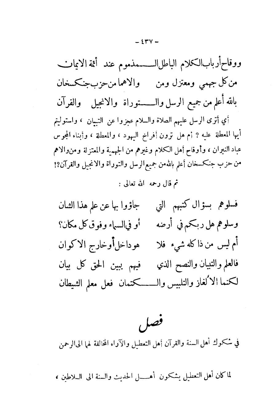 .. ووقاح أَرْبَاب الْكَلَام الْبَاطِل المذموم عِنْد أَئِمَّة الايمان ... من كل جهمي ومعتزل وَمن ... والاهما من حزب جنكسخان ... بِاللَّه أعلم من جَمِيع الرُّسُل والتوراة والانجيل وَالْقُرْآن ...