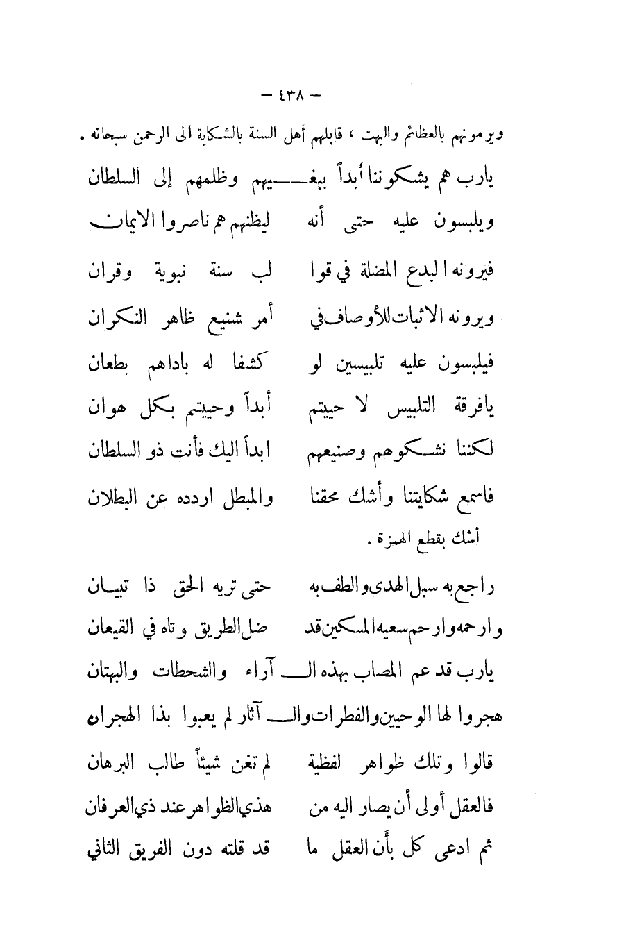 ويرمونهم بالعظائم والبهت قابلهم أهل السّنة بالشكاية الى الرَّحْمَن سُبْحَانَهُ ... يَا رب هم يشكوننا أبدا ببغيهم وظلمهم إِلَى السُّلْطَان ... وَيلبسُونَ عَلَيْهِ حَتَّى أَنه ... ليظنهم هم ناصروا الايمان