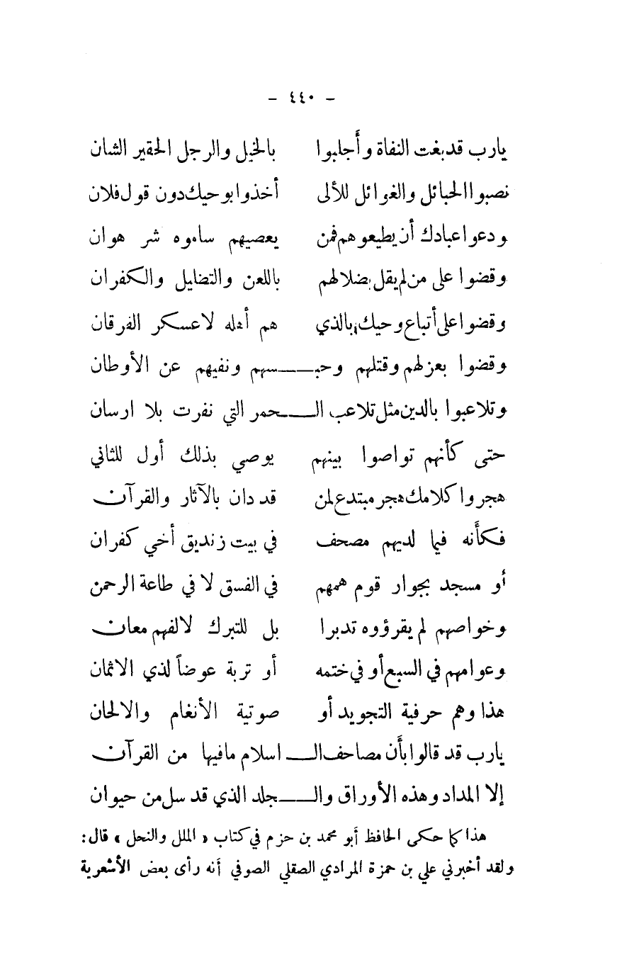يَا رب قد قَالُوا بِأَن مصاحف الاسلام مَا فِيهَا من الْقُرْآن ... إِلَّا المداد وَهَذِه الأوراق وَالْجَلد الَّذِي قد سل من حَيَوَان ...