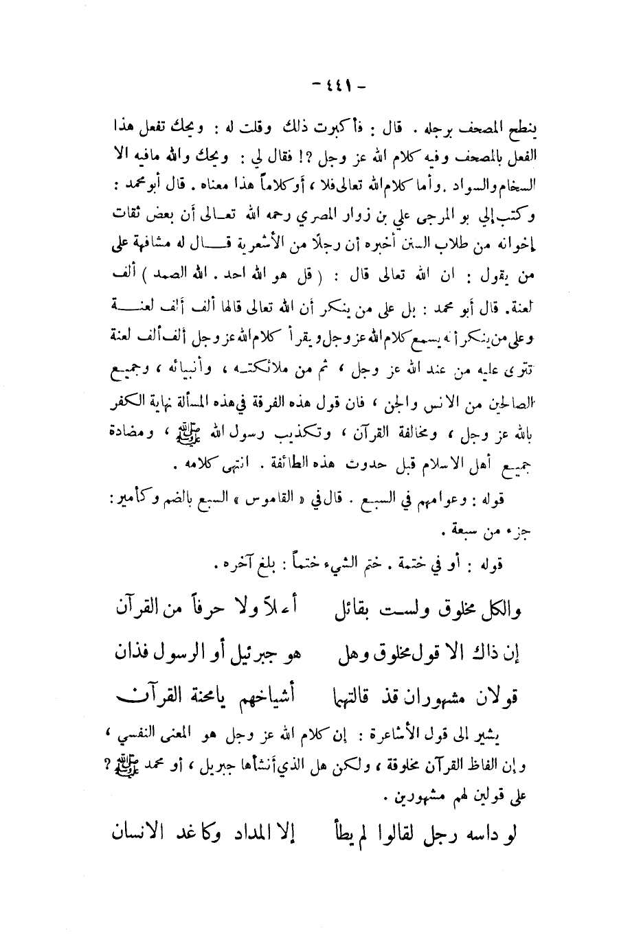 يَنْطَح الْمُصحف بِرجلِهِ قَالَ فأكبرت ذَلِك وَقلت لَهُ وَيحك تفعل هَذَا الْفِعْل بالمصحف وَفِيه كَلَام الله عز وَجل فَقَالَ لي وَيحك وَالله مَا فِيهِ الا السخام والسواد وَأما كَلَام الله تَعَالَى فَلَا أَو كلَاما هَذَا مَعْنَاهُ قَالَ ابو مُحَمَّد وَكتب الي بو المرجى عَليّ بن زوار الْمصْرِيّ رَحمَه الله تَعَالَى أَن بعض ثِقَات إخوانه من طلاب السّنَن اخبره أَن رجلا من الاشعرية قَالَ لَهُ مشافهة على من يَقُول ان الله تَعَالَى قَالَ {قل هُوَ الله أحد الله الصَّمد} ألف لعنة قَالَ ابو مُحَمَّد بل على من يُنكر ان الله تَعَالَى قَالَهَا ألف ألف لعنة وعَلى من يُنكر أَنه يسمع كَلَام الله عز وَجل وَيقْرَأ كَلَام الله عز وَجل ألف ألف لعنة تترى عَلَيْهِ من عِنْد الله عز وَجل ثمَّ من مَلَائكَته وأنبيائه وَجَمِيع الصَّالِحين من الانس وَالْجِنّ فان قَول هَذِه الْفرْقَة فِي هَذِه الْمَسْأَلَة نِهَايَة الْكفْر بِاللَّه عز وَجل وَمُخَالفَة الْقُرْآن وَتَكْذيب رَسُول الله صلى الله عَلَيْهِ وَسلم ومضادة جَمِيع اهل الاسلام قبل حُدُوث هَذِه الطَّائِفَة انْتهى كَلَامه