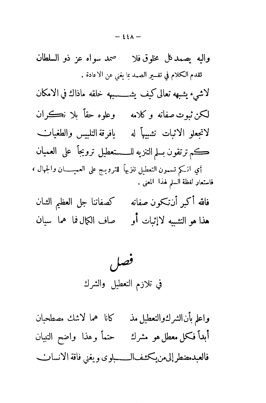 فِي تلازم التعطيل والشرك ... وَاعْلَم بِأَن الشّرك والتعطيل مذ ... كَانَا هما لَا شكّ مصطحبان ... أبدا فَكل معطل هُوَ مُشْرك ... حتما وَهَذَا وَاضح التِّبْيَان
