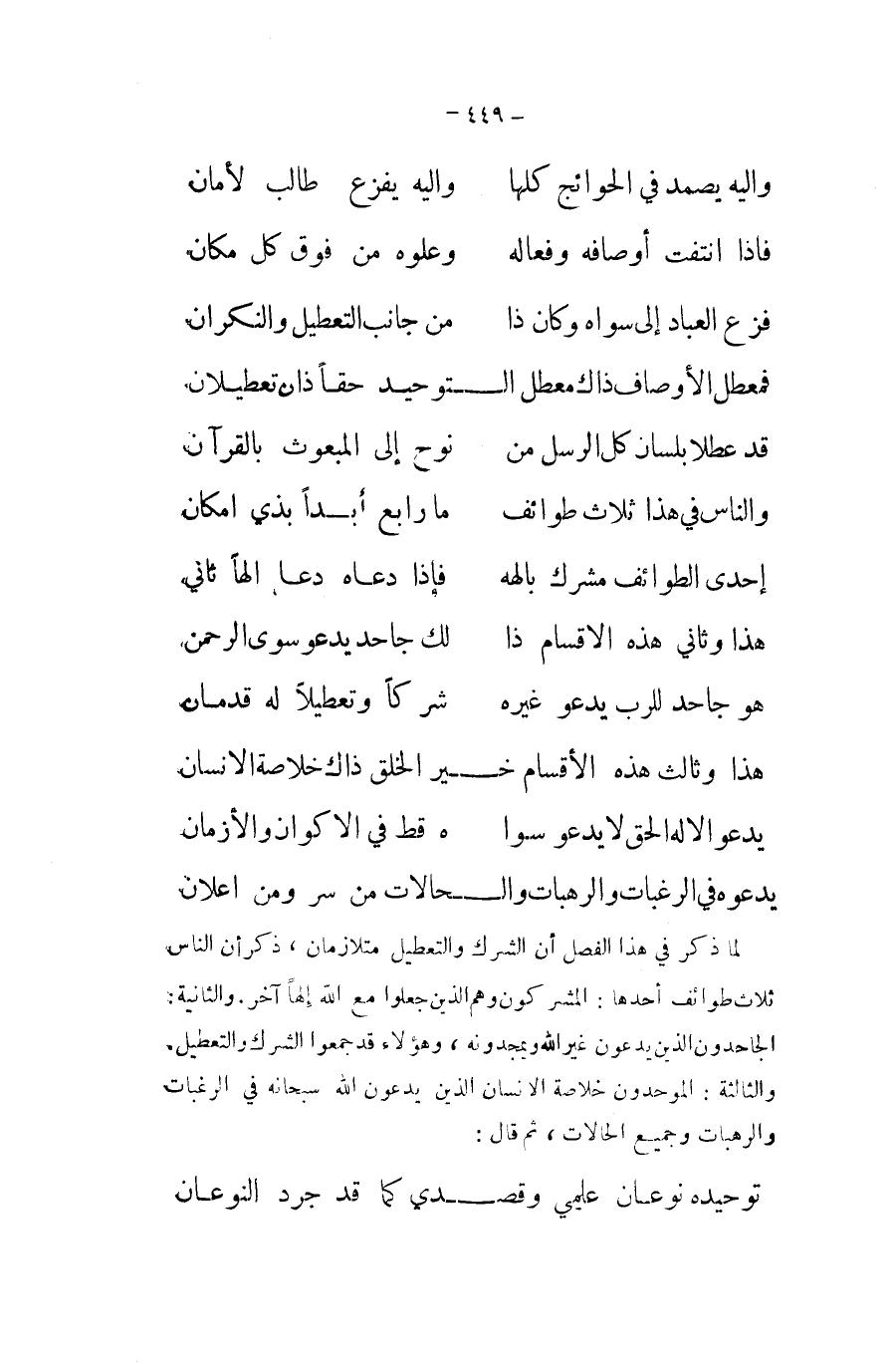 لما ذكر فِي هَذَا الْفَصْل أَن الشّرك والتعطيل متلازمان ذكر أَن النَّاس ثَلَاث طوائف أَحدهَا الْمُشْركُونَ وهم الَّذين جعلُوا مَعَ الله إِلَهًا آخر وَالثَّانيَِة الجاحدون الَّذين يدعونَ غير الله ويمجدونه وَهَؤُلَاء قد جمعُوا الشّرك والتعطيل وَالثَّالِثَة الموحدون خُلَاصَة الانسان الَّذين يدعونَ الله سُبْحَانَهُ فِي الرغبات والرهبات وَجَمِيع الْحَالَات ثمَّ قَالَ ... توحيده نَوْعَانِ علمي وقصدي كَمَا قد جرد النوعان ...