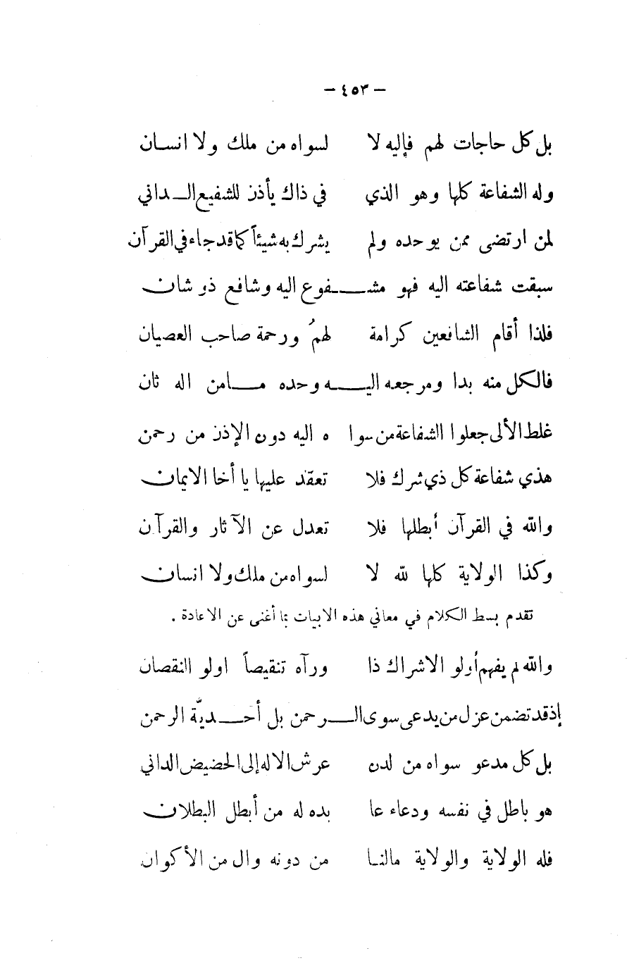 فَالْكل مِنْهُ بدا ومرجعه اليه وَحده مَا من اله ثَان ... غلط الألى جعلُوا الشَّفَاعَة من سوا ... هـ اليه دون الْإِذْن من رَحْمَن ... هذي شَفَاعَة كل ذِي شرك فَلَا ... تعقد عَلَيْهَا يَا أَخا الْإِيمَان