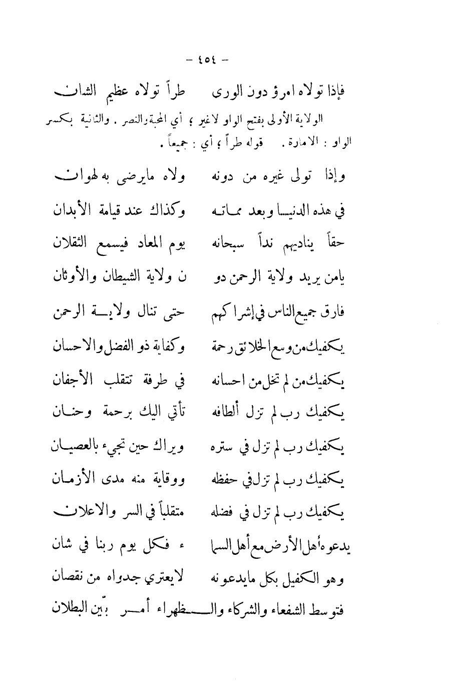 الْولَايَة الأولى بتفح الْوَاو لَا غير أَي الْمحبَّة والنصر والثانة بِكَسْر الْوَاو الامارة قَوْله طَرَأَ أَي جَمِيعًا ... وَإِذا تولى غَيره من دونه ... ولاه مَا يرضى بِهِ لهوان