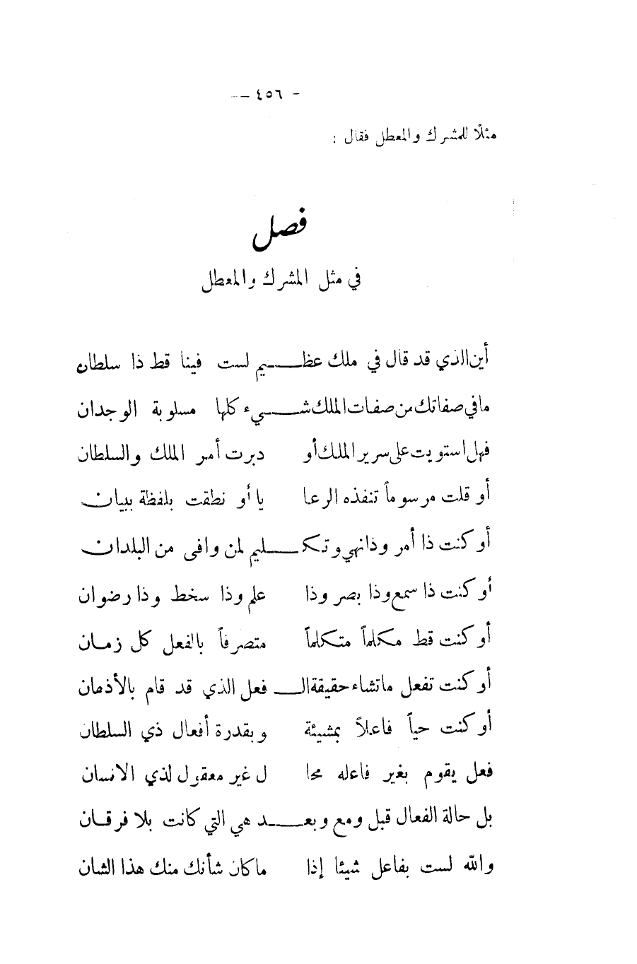 فِي مثل الْمُشرك والمعطل ... أَيْن الَّذِي قد قَالَ فِي ملك عَظِيم ... لست فِينَا قطّ ذَا سُلْطَان