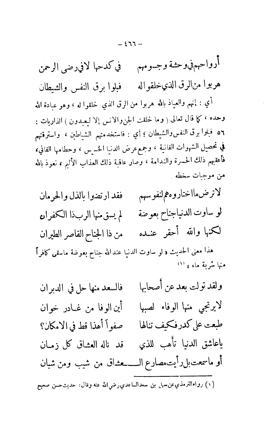 هَذَا معنى الحَدِيث لَو ساوت الدُّنْيَا عِنْد الله جنَاح بعوضة مَا سقى كَافِرًا مِنْهَا شربة مَاء ... وَلَقَد تولت بعد عَن أَصْحَابهَا ... فالسعد مِنْهَا حل فِي الدبران