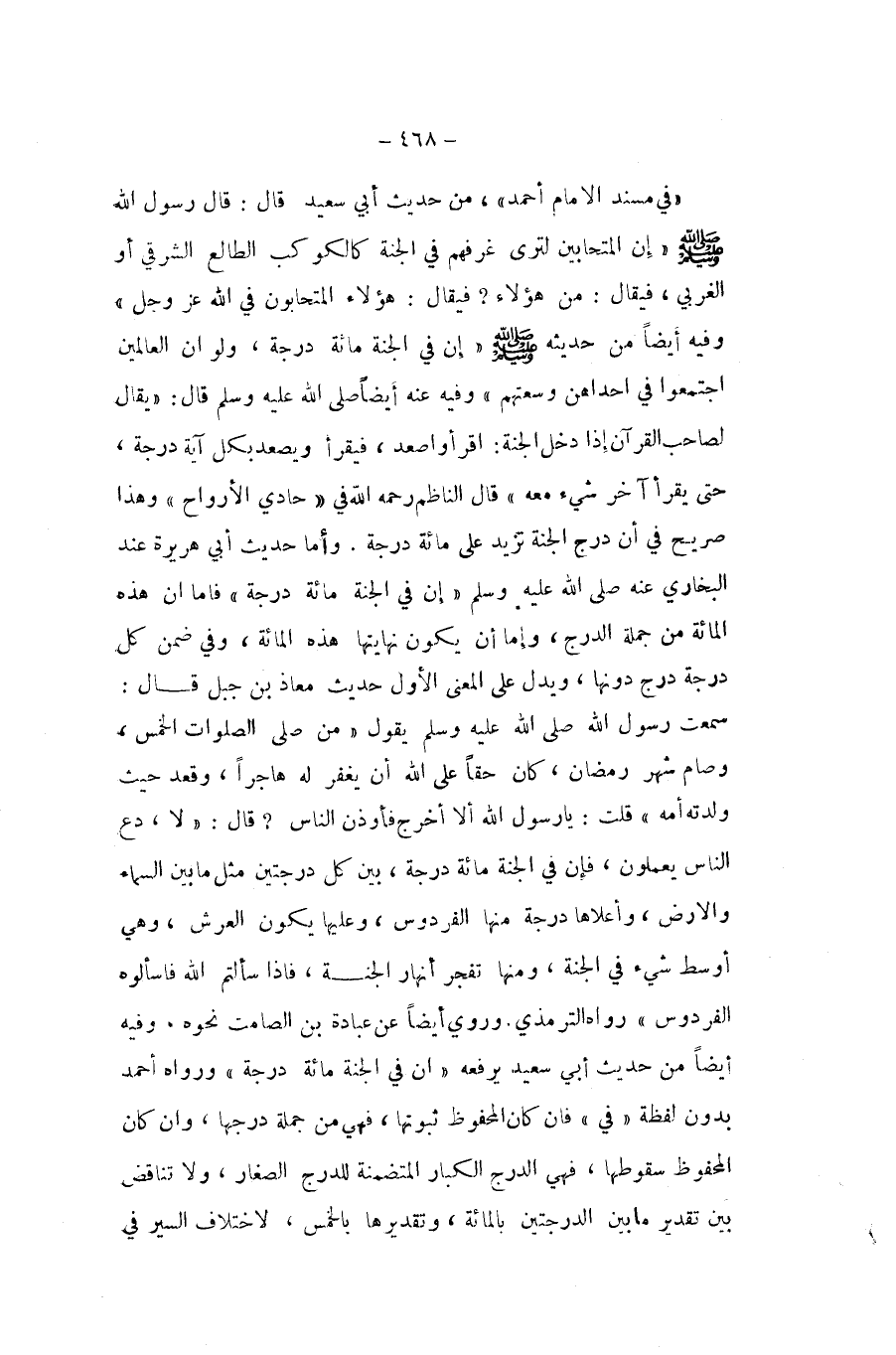 فِي مُسْند الامام احْمَد من حَدِيث ابي سعيد قَالَ قَالَ رَسُول الله صلى الله عَلَيْهِ وَسلم إِن المتحابين لترى غرفهم فِي الْجنَّة كَالْكَوْكَبِ الطالع الشَّرْقِي اَوْ الغربي فَيُقَال من هَؤُلَاءِ فَيُقَال هَؤُلَاءِ المتحابون ي الله عز وَجل وَفِيه ايضا من حَدِيثه صلى الله عَلَيْهِ وَسلم إِن فِي الْجنَّة مائَة دَرَجَة وَلَو أَن الْعَالمين اجْتَمعُوا فِي احداهن وسعتهم وَفِيه عَنهُ ايضا صلى الله عَلَيْهِ وَسلم قَالَ يُقَال لصَاحب الْقُرْآن إِذا دخل الْجنَّة اقْرَأ واصعد فيقرا ويصعد بِكُل آيَة دَرَجَة حَتَّى يقْرَأ آخر شَيْء مَعَه قَالَ النَّاظِم رَحمَه الله فِي حادي الارواح وَهَذَا صَرِيح فِي أَن درج الْجنَّة تزيد على مائَة دَرَجَة وَأما حَدِيث ابي هُرَيْرَة عِنْد البُخَارِيّ عَنهُ صلى الله عَلَيْهِ وَسلم إِن فِي الْجنَّة مائَة دَرَجَة فاما ان هَذِه الْمِائَة من جملَة الدرج واما ان يكون نهايتها هَذِه الْمِائَة وَفِي ضمن كل دَرَجَة درج دونهَا وَيدل على الْمَعْنى الاول حَدِيث معَاذ بن جبل قَالَ سَمِعت رَسُول اله صلى الله عَلَيْهِ وَسلم يَقُول من صلى الصَّلَوَات الْخمس وَصَامَ شهر رَمَضَان كَانَ حَقًا على الله ان يغْفر لَهُ هاجرا وَقعد حَيْثُ وَلدته امهِ قلت يَا رَسُول الله الا اخْرُج فأوذن النَّاس قَالَ لَا دع النَّاس يعْملُونَ فان فِي الْجنَّة مائَة دَرَجَة بَين كل دَرَجَتَيْنِ مثل مَا بَين السَّمَاء والارض واعلاها دَرَجَة مِنْهَا الفردوس وَعَلَيْهَا يكون الْعَرْش وَهِي اوسط شَيْء فِي الْجنَّة وَمِنْهَا تفجر انهار الْجنَّة فاذا سَأَلْتُم الله فَاسْأَلُوهُ الفردوس وَرَاه التِّرْمِذِيّ وَرُوِيَ ايضا عَن عبَادَة بن الصَّامِت نَحوه وَفِيه ايضا من حَدِيث ابي سعيد يرفعهُ ان فِي الْجنَّة مائَة دَرَجَة وَرَوَاهُ احْمَد بِدُونِ لَفْظَة فِي فان كَانَ الْمَحْفُوظ ثُبُوتهَا فَهِيَ من جملَة درجها وان كَانَ الْمَحْفُوظ سُقُوطهَا فَهِيَ الدرج الْكِبَار المتضمنة للدرج الصغار وَلَا تنَاقض بَين تَقْدِير مَا بَين الدرجتين بِالْمِائَةِ وتقديرها بالخمس لاخْتِلَاف السّير فِي