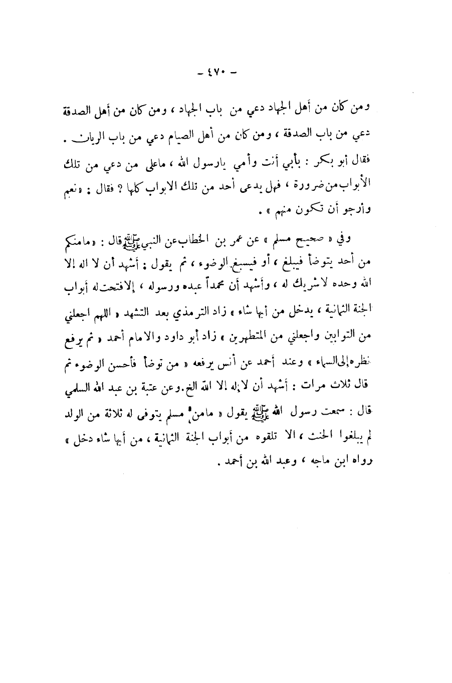 وَفِي صَحِيح مُسلم عَن عمر بن الْخطاب عَن النَّبِي صلى الله عَلَيْهِ وَسلم قَالَ مَا مِنْكُم من أحد يتوضا فَيبلغ اَوْ فيسبغ الْوضُوء ثمَّ يَقُول أشهد أَن لَا اله الا اله وَحده لَا شريك لَهُ وَأشْهد أَن مُحَمَّدًا عَبده وَرَسُوله إِلَّا فتحت لَهُ أَبْوَاب الْجنَّة الثَّمَانِية يدْخل من ايها شَاءَ زَاد ابو دَاوُد والامام احْمَد ثمَّ يرفع نظره الى السَّمَاء وَعند احْمَد عَن انس يرفعهُ من تَوَضَّأ فَأحْسن الْوضُوء ثمَّ قَالَ ثَلَاث مَرَّات أشهد أَن لَا اله الا الله الخ وَعَن عتبَة بن عبد الله السّلمِيّ قَالَ سَمِعت رَسُول الله صلى الله عَلَيْهِ وَسلم يَقُول مَا من مُسلم يتوفى لَهُ ثَلَاثَة من الْوَلَد لم يبلغُوا الْحِنْث الا تلقوهُ نم أَبْوَاب الْجنَّة الثَّمَانِية من أَيهَا شَاءَ دخل رَوَاهُ ابْن مَاجَه وَعبد الله بن احْمَد