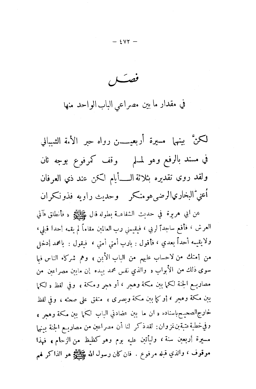 عَن ابي هُرَيْرَة فِي حَدِيث الشَّفَاعَة قَالَ صلى الله عَلَيْهِ وَسلم فأنطلق فَآتي الْعرض فأقع سَاجِدا لرَبي فيقيمني رب الْعَالمين مقَاما لم يقمه أحدا قبلي وَلَا يقيمه أحدا بعدِي فاقول يَا رب أمتِي أمتِي فَيَقُول يَا مُحَمَّد ادخل من أمتك من لاحساب عَلَيْهِم من الْبَاب الْأَيْمن وهم شركاه النَّاس فِيمَا سوى ذَلِك من الابواب وَالَّذِي نفس مُحَمَّد بِيَدِهِ إِن مَا بَين مصراعين فِيمَا سوى ذَلِك من مصاريع الْجنَّة كَمَا بَين مَكَّة وهجر أَو هجر وَمَكَّة وَفِي لفظ لَكمَا بَين مَكَّة وهجر أَو كَمَا بَين مَكَّة وَبصرى مُتَّفق على صِحَّته وَفِي لفظ خَارج الصَّحِيح باسناده ان مَا بَين عضادتي الْبَاب لَكمَا بَين مَكَّة وهجر وَفِي خطْبَة عتبَة بن غَزوَان لقد ذكر لنا أَن مصراعين من مصاريع الْجنَّة بَينهمَا مسيرَة اربعين سنة وليأتين عَلَيْهِ يَوْم وَهُوَ كظيظ من الزحام فَهَذَا مَوْقُوف وَالَّذِي قبله مَرْفُوع فَإِن كَانَ رَسُول الله صلى الله عَلَيْهِ وَسلم هُوَ الذاكر لَهُم