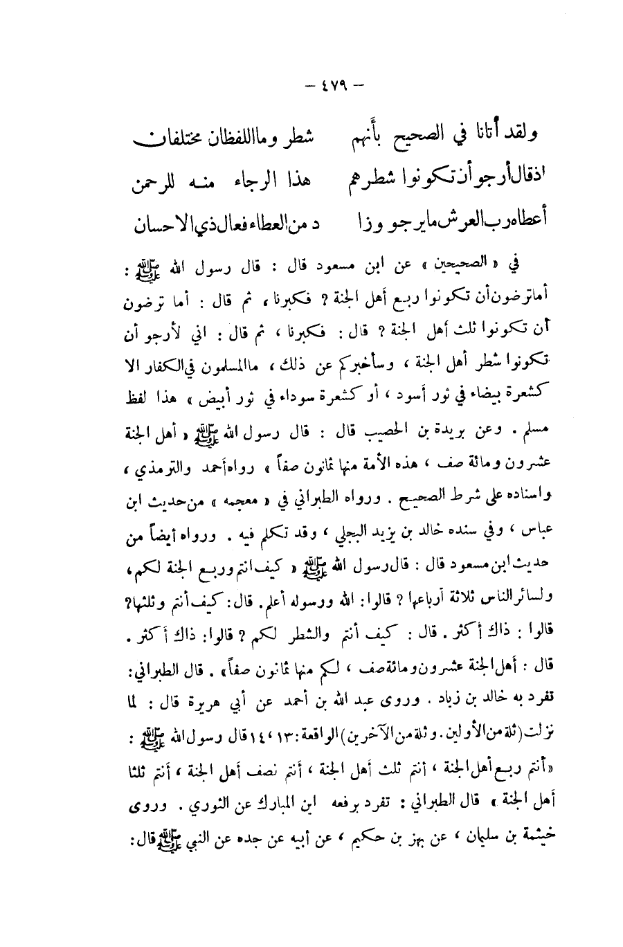 .. وَلَقَد أَتَانَا فِي الصَّحِيح بِأَنَّهُم ... شطر وَمَا اللفظان مُخْتَلِفَانِ ... إِذْ قَالَ أَرْجُو أَن تَكُونُوا شطرهم ... هَذَا الرَّجَاء مِنْهُ للرحمن