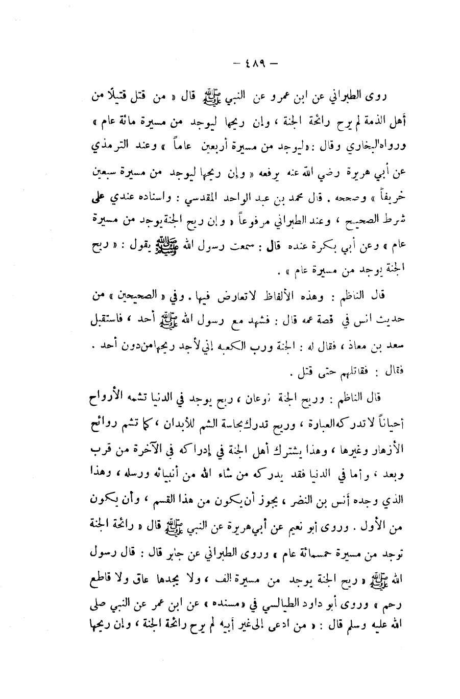 روى الطَّبَرَانِيّ عَن ابْن عَمْرو عَن النَّبِي صلى الله عَلَيْهِ وَسلم قَالَ من قتل قَتِيلا من اهل الذِّمَّة لم يرح رَائِحَة الْجنَّة وَإِن رِيحهَا ليوجد من مسيرَة مائَة عَام وَرَوَاهُ البُخَارِيّ وَقَالَ ليوجد م من مسيرَة اربعين عَاما وَعند التِّرْمِذِيّ عَن ابي هُرَيْرَة رَضِي الله عَنهُ يرفعهُ وَإِن رِيحهَا ليوجد من مسيرَة سبعين خَرِيفًا وَصَححهُ قَالَ مُحَمَّد بن عبد الْوَاحِد الْمَقْدِسِي واسناده عِنْدِي على شَرط الصَّحِيح وَعند الطَّبَرَانِيّ مَرْفُوعا وان ريح الْجنَّة يُوجد من ميسرَة عَام وَعَن ابي بكرَة عِنْد قَالَ سَمِعت رَسُول الله صلى الله عَلَيْهِ وَسلم يَقُول ريح الْجنَّة يُوجد من مسيرَة عَام