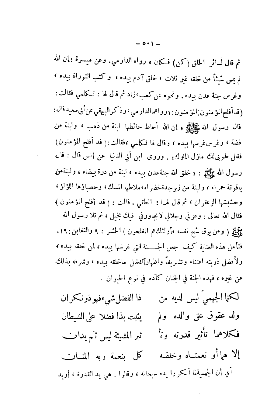 ثمَّ قَالَ لسَائِر الْخلق كن فَكَانَ رَوَاهُ الدَّارمِيّ وَعَن ميسرَة إِن الله لم يمس شَيْئا من خلقه غير ثَلَاث خلق آدم بِيَدِهِ وَكتب التَّوْرَاة بِيَدِهِ وغرس جنَّة عدن بِيَدِهِ وَنَحْوه عَن كَعْب زَاد ثمَّ قَالَ لَهَا تكلمي فَقَالَت قد أَفْلح الْمُؤْمِنُونَ الْمُؤْمِنُونَ رَوَاهُمَا الدَّارمِيّ وَذكر الْبَيْهَقِيّ عَن ابي سعيد قَالَ قَالَ رَسُول الله صلى الله عَلَيْهِ وَسلم إِن الله حائطها لبنة من ذهب ولبنة من فضَّة وغرس غرسها بِيَدِهِ وَقَالَ لَهَا تكلمي فَقَالَت {قد أَفْلح الْمُؤْمِنُونَ} فَقَالَ طُوبَى لَك منزل الْمُلُوك وروى ابْن ابي الدُّنْيَا عَن انس قَالَ قَالَ رَسُول الله صلى الله عَلَيْهِ وَسلم خلق الله جنَّة عدن بِيَدِهِ لبنة من درة بَيْضَاء ولبنة من ياقوتة حَمْرَاء ولبنة من زبرجد خضراء ملاطها الْمسك وحصباؤها اللُّؤْلُؤ وحشيشها الزَّعْفَرَان ثمَّ قَالَ لَهَا انْطِقِي قَالَت قد أَفْلح الْمُؤْمِنُونَ فَقَالَ الله تَعَالَى وَعِزَّتِي وَجَلَالِي لَا يجاورون فِيك بخيل ثمَّ تَلا رَسُول الله صلى الله عَلَيْهِ وَسلم وَمن يُوقَ شح نَفسه فَأُولَئِك هم المفلحون الْحَشْر والتغاين فَتَأمل هَذِه الْعِنَايَة كَيفَ جعل الْجنَّة الَّتِي غرسها بِيَدِهِ لمن خلقه بِيَدِهِ ولأفضل ذُريَّته اعتناء وتشريفا واظهارا لفضل مَا خلقه بِيَدِهِ وشرفه بذلك عَن غَيره فَهَذِهِ الْجنَّة فِي الْجنان كآدم فِي نوع الْحَيَوَان ... لكنما الجهمي لَيْسَ لَدَيْهِ من ... ذَا الْفضل شَيْء فَهُوَ ذُو نكران