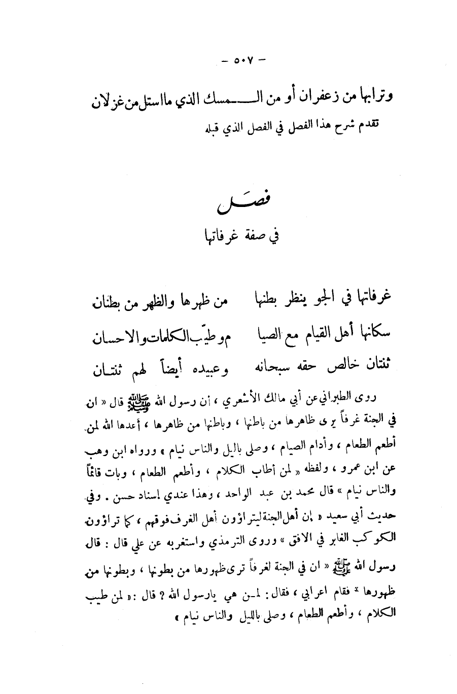 فِي صفة غرفاتها ... غرفاتها فِي الجو ينظر بَطنهَا ... من ظهرهَا وَالظّهْر من بطْنَان ... سكانها أهل الْقيام مَعَ الصيا ... م وَطيب الْكَلِمَات والاحسان