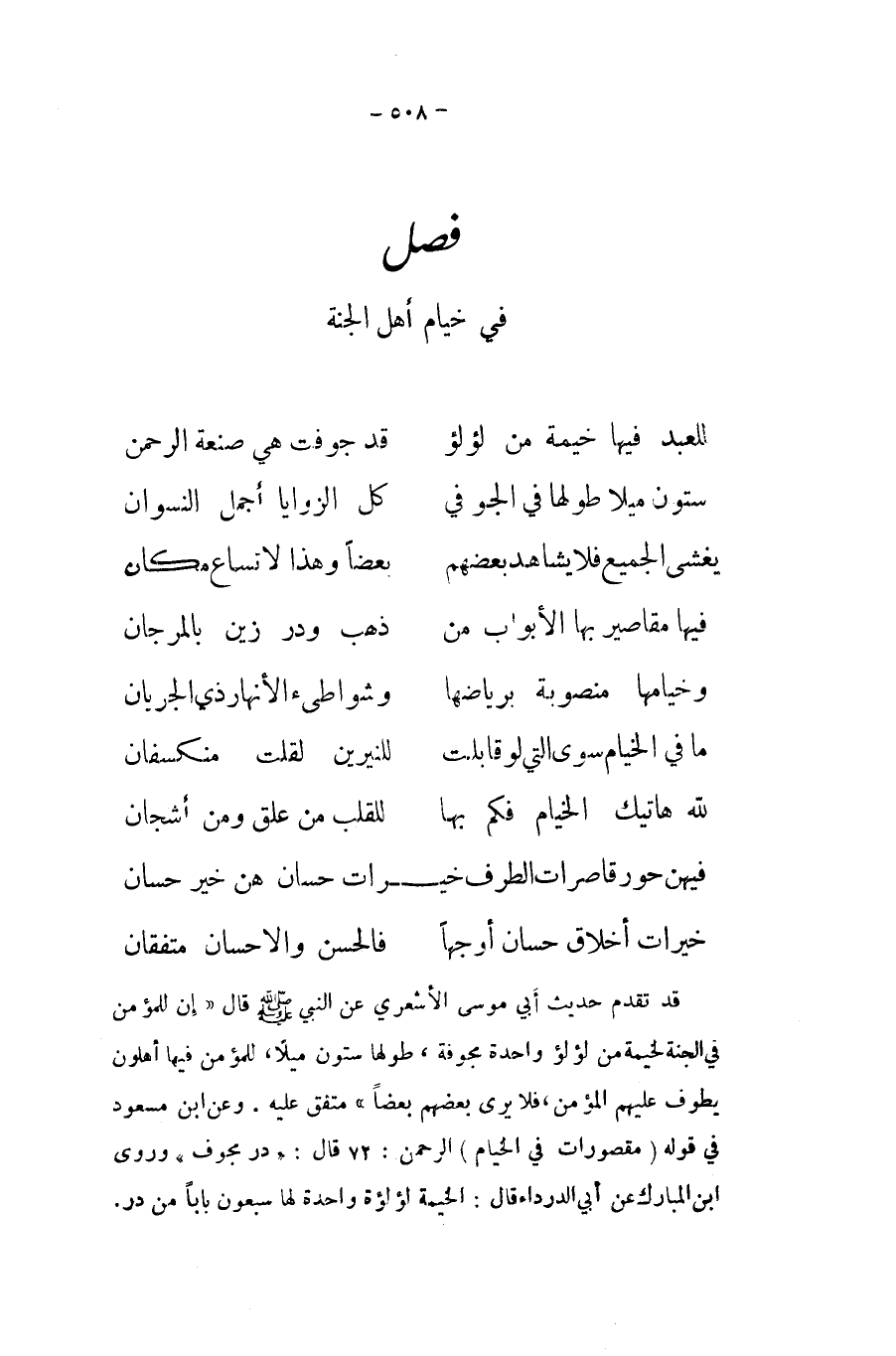 فِيهِنَّ حور قاصرات الطّرف خيرات حسان هن خير حسان ... خيرات أَخْلَاق حسان أوجها ... فالحسن والاحسان متفقان ...