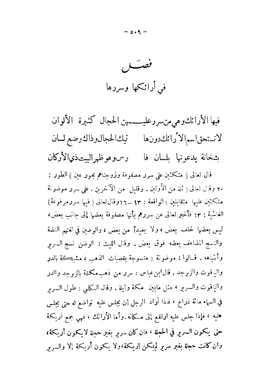 قَالَ تَعَالَى {متكئين على سرر مصفوفة وزوجناهم بحور عين} الطّور وَقَالَ تَعَالَى {ثلة من الْأَوَّلين وَقَلِيل من الآخرين على سرر موضونة متكئين عَلَيْهَا مُتَقَابلين} الْوَاقِعَة وَقَالَ تَعَالَى {فِيهَا سرر مَرْفُوعَة} الغاشية فَأخْبر تَعَالَى عَن سررهم بِأَنَّهَا مصفوفة بَعْضهَا إِلَى جَانب بعض لَيْسَ بَعْضهَا خلف بعض وَلَا بَعيدا من بعض والوضين فِي لغتهم النضة والنسج المضاعف بعضه فَوق بعض وَقَالَ اللَّيْث الوضن نسج السرير وأشباهه قَالُوا موضونة منسوجة بقصبات الذَّهَب مشبكة بالدر والياقوت والزبرجد قَالَ ابْن عَبَّاس سرر من ذهب مكللة بالزبرجد والدر والياقوت والسرير مثل مَا بَين مَكَّة وأيله وَقَالَ الْكَلْبِيّ طول السرير فِي السَّمَاء مائَة ذِرَاع فاذا أَرَادَ الرجل أَن يجلس عَلَيْهِ تواضع لَهُ حَتَّى يجلس عَلَيْهِ فَإِذا جلس عَلَيْهِ ارْتَفع إِلَى مَكَانَهُ وَأما الأرائك فَهِيَ جمع اريكة حَتَّى يكون السرير فِي الحجلة فان كَانَ سَرِير بِغَيْر حجلة لَا يكون أريكة وان كَانَت حجلة بِغَيْر سَرِير لم يكن أريكة وَلَا يكون أريكة إِلَّا والسرير