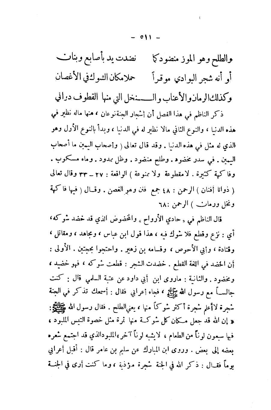 ذكر النَّاظِم فِي هَذَا الْفَصْل ان أَشجَار الْجنَّة نَوْعَانِ مِنْهَا مَاله نَظِير فِي هَذِه الدُّنْيَا وَالنَّوْع الثَّانِي مَا لَا نَظِير لَهُ فِي الدُّنْيَا وَبَدَأَ بالنوع الأول وَهُوَ الَّذِي لَهُ مثل فِي هَذِه الدُّنْيَا وَقد قَالَ تَعَالَى {وَأَصْحَاب الْيَمين مَا أَصْحَاب الْيَمين فِي سدر مخضود وطلح منضود وظل مَمْدُود وَمَاء مسكوب وَفَاكِهَة كَثِيرَة لَا مَقْطُوعَة وَلَا مَمْنُوعَة} الْوَاقِعَة وَقَالَ تَعَالَى {ذواتا أفنان} الرَّحْمَن جمع فنن وَهُوَ الْغُصْن وَقَالَ {فيهمَا فَاكِهَة ونخل ورمان} الرَّحْمَن