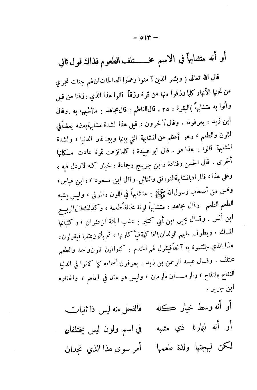 قَالَ الله تَعَالَى {وَبشر الَّذين آمنُوا وَعمِلُوا الصَّالِحَات أَن لَهُم جنَّات تجْرِي من تحتهَا الْأَنْهَار كلما رزقوا مِنْهَا من ثَمَرَة رزقا قَالُوا هَذَا الَّذِي رزقنا من قبل وَأتوا بِهِ متشابها} الْبَقَرَة قَالَ النَّاظِم قَالَ مُجَاهِد مَا أشبهه بِهِ وَقَالَ ابْن زيد يعرفونه وَقَالَ آخَرُونَ قيل هَذَا لشدَّة مشابهة بعضه بَعْضًا فِي اللَّوْن والطعم وَهُوَ أعظم من المشابهة الَّتِي بَينهَا وَبَين ثمار الدُّنْيَا ولشدة المشابهة قَالُوا هَذَا هُوَ قَالَ أَبُو عُبَيْدَة كلما نزعت ثَمَرَة عَادَتْ مَكَانهَا أُخْرَى قَالَ الْحسن وَقَتَادَة وَابْن جريج وَجَمَاعَة خِيَار كُله لارذل فِيهِ وعَلى هَذَا فَالْمُرَاد بالمشابهة التوافق والتماثل وَقَالَ ابْن مَسْعُود وَابْن عَبَّاس وناس من أَصْحَاب رَسُول الله صلى الله عَلَيْهِ وَسلم متشابها فِي اللَّوْن والمرئي وَلَيْسَ يشبه الطّعْم الطّعْم وَقَالَ مُجَاهِد متشابها لَونه مُخْتَلفا طعمه وَكَذَلِكَ قَالَ الرّبيع ابْن أنس وَقَالَ يحيى ابْن أبي كثير عشب الْجنَّة الزَّعْفَرَان وكثبانها الْمسك وَيَطوف عَلَيْهِم الْولدَان بالفاكهة فيأكلونها ثمَّ يأْتونَ بِمِثْلِهَا فَيَقُولُونَ هَذَا الَّذِي جئتمونا بِهِ آنِفا فَيَقُول لَهُم الخدم كَلَوْ فَإِن اللَّوْن وَاحِد والطعم مُخْتَلف وَقَالَ عبد الرَّحْمَن بن زيد يعْرفُونَ اسماءه كَمَا كَانُوا فِي الدُّنْيَا التفاح بالتفاح وَالرُّمَّان بالرمان وَلَيْسَ هُوَ مثله فِي الطّعْم وَاخْتَارَهُ ابْن جرير ... أَو أَنه وسط خِيَار كُله فالفحل مِنْهُ لَيْسَ ذَا ثنيان