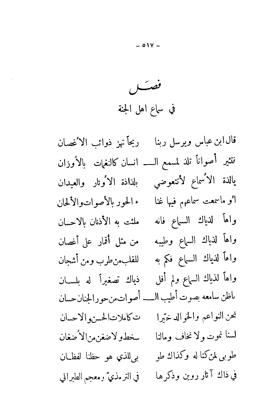 مَا ظن سامعه بِصَوْت اطيب الْأَصْوَات من حور الْجنان حسان ... نَحن النواعم والخوالد خيرا ... ت كاملات الْحسن والاحسان ... لسنا نموت وَلَا نَخَاف ومالنا ... سخط وَلَا ضغن من الأضغان