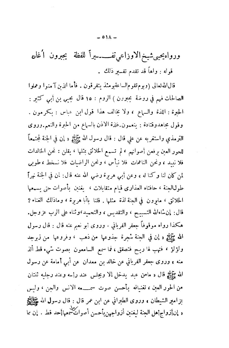 قَالَ الله تَعَالَى {وَيَوْم تقوم السَّاعَة يَوْمئِذٍ يتفرقون فَأَما الَّذين آمنُوا وَعمِلُوا الصَّالِحَات فهم فِي رَوْضَة يحبرون} الرّوم قَالَ يحيى بن ابي كثير الْحبرَة اللَّذَّة وَالسَّمَاع وَلَا يُخَالف هَذَا قَول ابْن عَبَّاس يكرمون وَقَول مُجَاهِد وَقَتَادَة ينعمون فلذة الاذن بِالسَّمَاعِ من الْحبرَة وَالنعَم وروى التِّرْمِذِيّ وَاسْتَغْرَبَهُ عَن عَليّ قَالَ قَالَ رَسُول الله صلى الله عَلَيْهِ وَسلم إِن فِي الْجنَّة لمجتمعا للحور الْعين يرفعن أَصْوَاتهم لم تسمع الْخَلَائق بِمِثْلِهَا يقلن نَحن الخالدت فَلَا نبيد وَنحن الناعمات فَلَا نبأس وَنحن الراضيات فَلَا نسخط طُوبَى لمن كَانَ لنا وَكُنَّا لَهُ وَعَن أبي هُرَيْرَة رَضِي الله عَنهُ قَالَ إِن فِي الْجنَّة نَهرا طول الْجنَّة حافتاه العذارى قيام متقابلات يغنين باصوات حَتَّى يسْمعهَا الْخَلَائق مَا يرَوْنَ فِي الْجنَّة لَذَّة مثلهَا قُلْنَا يَا ابا هُرَيْرَة وَمَا ذَلِك الْغناء قَالَ إِن شَاءَ الله التَّسْبِيح وَالتَّقْدِيس والتحميد وثناء على الرب عز وَجل هَكَذَا رَوَاهُ مَوْقُوفا جَعْفَر الْفِرْيَانِيُّ وروى ابو نعيم عَنهُ قَالَ قَالَ رَسُول الله صلى الله عَلَيْهِ وَسلم إِن فِي الْجنَّة شَجَرَة جذوعها من ذهب وفروعها من زبرجد ولؤلؤ فتهب لَهَا الرّيح فتصفق فَمَا سمع السامعون بِصَوْت شَيْء قطّ ألذ مِنْهُ وروى جَعْفَر الْفِرْيَانِيُّ عَن خَالِد بن معدان عَن ابي امامة عَن رَسُول الله صلى الله عَلَيْهِ وَسلم قَالَ مَا من عبد يدْخل إِلَّا وَيجْلس عِنْد رَأسه وَعند رجلَيْهِ ثِنْتَانِ من الْحور الْعين تغنيانه بِأَحْسَن صَوت سَمعه الانس وَالْجِنّ وَلَيْسَ بمزامير الشَّيْطَان وروى الطَّبَرَانِيّ عَن ابْن عمر قَالَ قَالَ رَسُول الله صلى الله عَلَيْهِ وَسلم إِن ازواج اهل الْجنَّة ليغنين ازواجهن بِأَحْسَن أصوات سَمعهَا اُحْدُ قطّ إِن مِمَّا