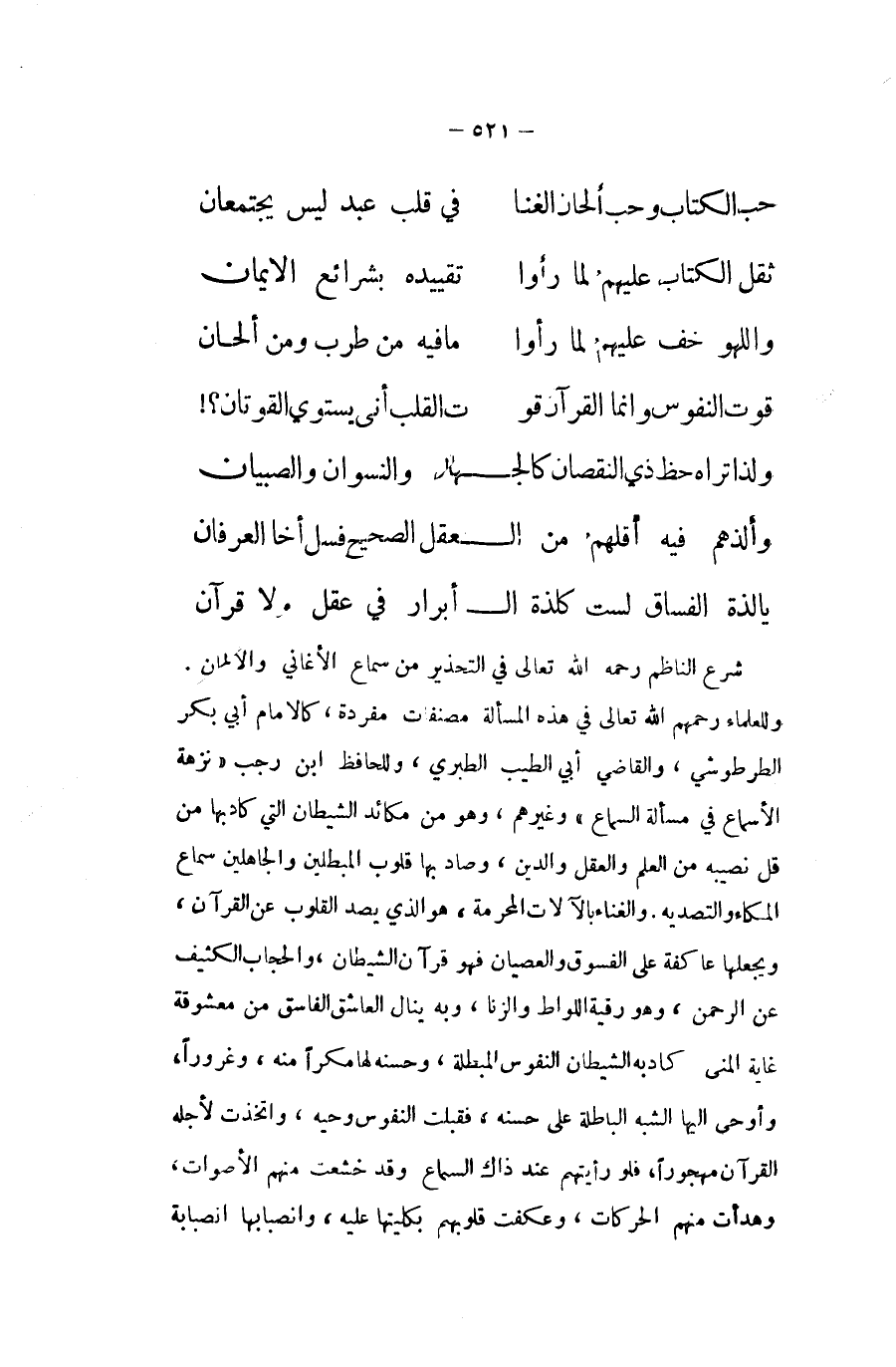 .. حب الْكتاب وَحب الحان الْغِنَا ... فِي قلب عبد لَيْسَ يَجْتَمِعَانِ