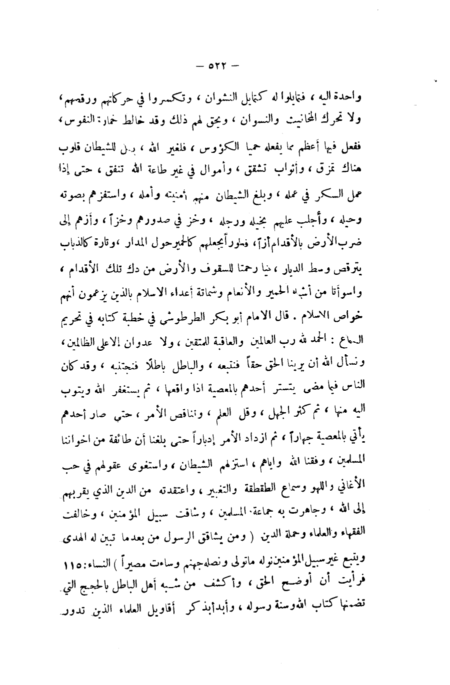 وَاحِدَة اليه فتمايلوا لَهُ كتمايل النشوان وتكسروا فِي حركاتهم ورقصهم وَلَا تحرّك المخانيث والنسوان ويحق لَهُم ذَلِك وَقد خالط خمارة النُّفُوس فَفعل فِيهَا أعظم مِمَّا يَفْعَله حميا الكؤوس فلغير الله بل للشَّيْطَان قُلُوب هُنَاكَ تمزق وأثواب تشقق وأموال فِي غير طَاعَة الله تنْفق حَتَّى إِذا عمل السكر فِي عمله وَبلغ الشَّيْطَان مِنْهُم أمْنِيته وأمله واستفزهم بِصَوْتِهِ وحيله وأجلب عَلَيْهِم بخيله وَرجله وخز فِي صُدُورهمْ وخزا وأزهم إِلَى ضرب الأَرْض بالأقدام أزا فطورا يجعلهم كالحمير حول الْمدَار وَتارَة كالذباب يترقص وسط الديار فيا رحمتا للسقوف وَالْأَرْض من دك تِلْكَ الْأَقْدَام واسوأتا من أشباه الْحمير والأنعام وشماته أَعدَاء الاسلام بالذين يَزْعمُونَ أَنهم خَواص الاسلام قَالَ الامام ابو بكر الطرطوشي فِي خطْبَة كِتَابه فِي تَحْرِيم السماع الْحَمد لله رب الْعَالمين وَالْعَاقبَة لِلْمُتقين وَلَا عدوان إِلَّا على الظَّالِمين ونسأل الله ان يرينا الْحق حَقًا فنتبعه وَالْبَاطِل بَاطِلا فنجتنبه وَقد كَانَ النَّاس فِيمَا مضى يتستر أحدهم بالمعصية اذا وَاقعهَا ثمَّ يسْتَغْفر الله وَيَتُوب اليه مِنْهَا ثمَّ كثر الْجَهْل وَقل الْعلم ونناقص الْأَمر حَتَّى صَار أحدهم يَأْتِي بالمعصية جهارا ثمَّ ازْدَادَ الْأَمر إدبارا حَتَّى بلغنَا ان طَائِفَة من اخواننا الْمُسلمين وفقنا الله واياهم استزلهم الشَّيْطَان واستغوى عُقُولهمْ فِي حب الأغاني وَاللَّهْو وَسَمَاع الطقطقة والتغبير واعتقدته من الدّين الَّذِي يقربهُمْ إِلَى الله وجاهرت بِهِ جمَاعَة الْمُسلمين وشاقت سَبِيل الْمُؤمنِينَ وخالفت الْفُقَهَاء وَالْعُلَمَاء وَحَملَة الدّين {وَمن يُشَاقق الرَّسُول من بعد مَا تبين لَهُ الْهدى وَيتبع غير سَبِيل الْمُؤمنِينَ نوله مَا تولى ونصله جَهَنَّم وَسَاءَتْ مصيرا} النِّسَاء فَرَأَيْت أَن أوضح الْحق وأكشف من شبه اهل الْبَاطِل بالحجج الَّتِي تضمنها كتاب الله وَسنة رَسُوله وأبدأ بِذكر اقاويل الْعلمَاء الَّذين تَدور