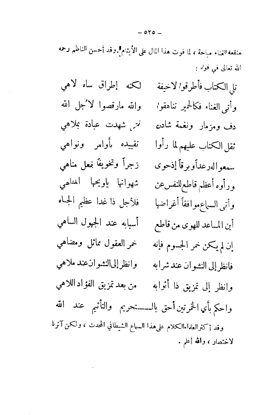 مَنْفَعَة الْغناء مُبَاحَة لما فَوت هَذَا المَال على الايتام وَقد احسن النَّاظِم رَحمَه الله تَعَالَى فِي قَوْله ... تلِي الْكتاب فَأَطْرقُوا لَا خيفة ... لكنه إطراق ساه لاهي ... وأتى الْغناء فكالحمير تناهقوا ... وَالله مَا رقصوا لأجل الله ... دف ومزمار ونغمة شادن ... فَمَتَى شهِدت عبَادَة بملاهي
