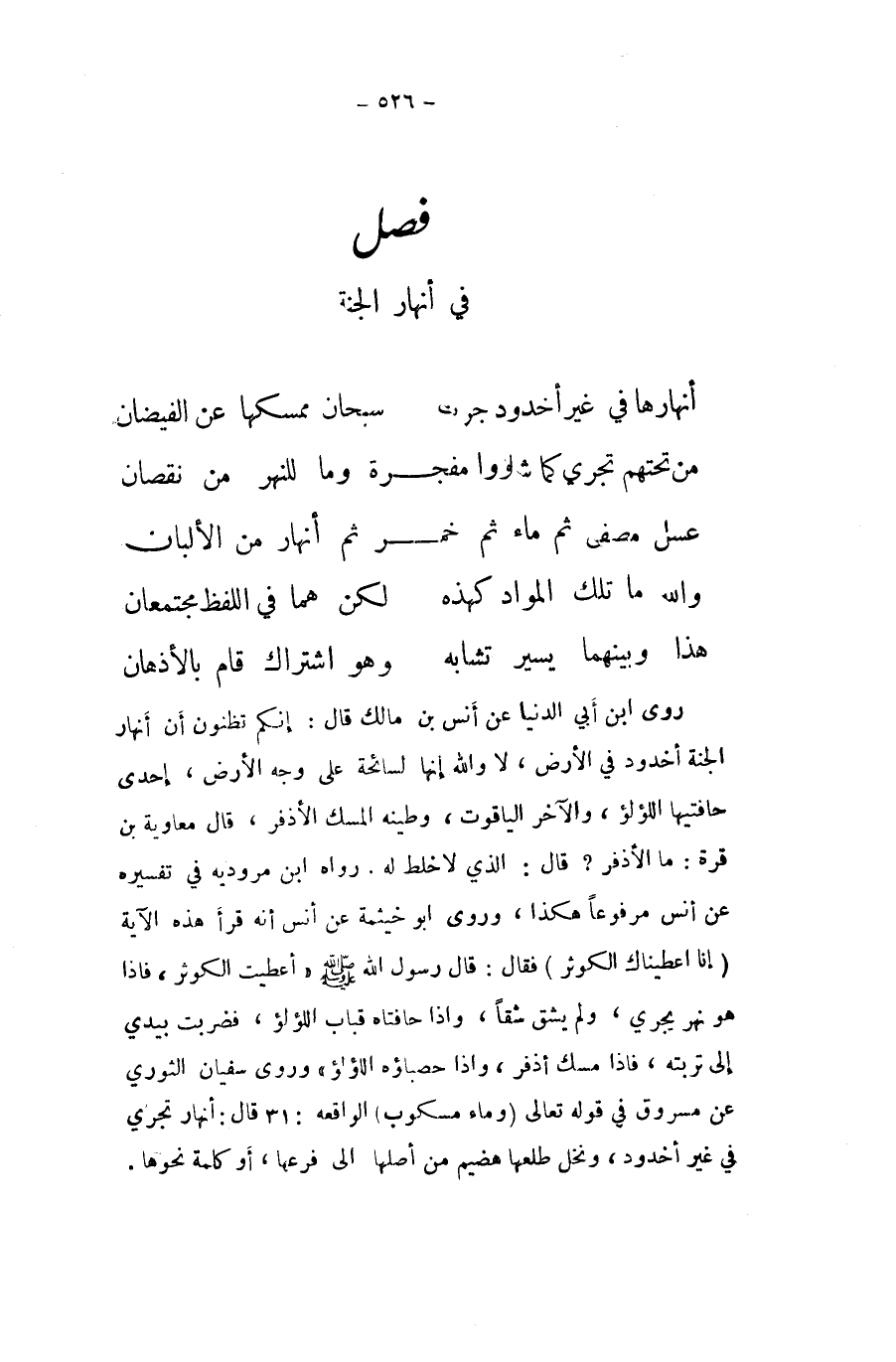 روى ابْن ابي الدُّنْيَا عَن انس بن مَالك قَالَ إِنَّكُم تظنون أَن أَنهَار الْجنَّة أخدُود فِي الأَرْض لَا وَالله إِنَّهَا لسائحه على وَجه الأَرْض إِحْدَى حافتيها اللُّؤْلُؤ وَالْآخر الْيَاقُوت وطينه الْمسك الاذفر قَالَ مُعَاوِيَة بن قُرَّة مَا الأذفر قَالَ مُعَاوِيَة بن قُرَّة مَا الأذفر قَالَ الَّذِي لَا خلط لَهُ رَوَاهُ ابْن مَرْوُدَيْهِ فِي تَفْسِيره عَن أنس مَرْفُوعا هَكَذَا وروى ابو خَيْثَمَة عَن انس أَنه قَرَأَ هَذِه الْآيَة {إِنَّا أعطيناك الْكَوْثَر} فَقَالَ قَالَ رَسُول الله صلى الله عَلَيْهِ وَسلم أَعْطَيْت الْكَوْثَر فاذا هُوَ نهر يجْرِي وَلم يشق شقا واذا حافتاه قباب اللُّؤْلُؤ فَضربت بيَدي إِلَى تربته فاذا مسك أذفر واذا حصباؤه اللُّؤْلُؤ وروى سُفْيَان الثَّوْريّ عَن مَسْرُوق فِي قَوْله تَعَالَى {وَمَاء مسكوب} الْوَاقِعَة قَالَ أَنهَار تجْرِي فِي غير أخدُود ونخل طلعها هضيم من اصلها الى فرعها أَو كلمة نَحْوهَا