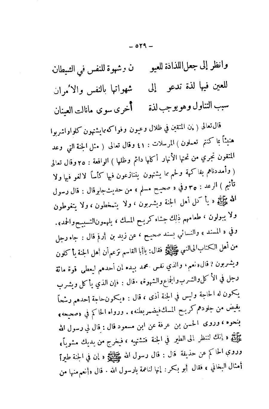 قَالَ تَعَالَى {إِن الْمُتَّقِينَ فِي ظلال وعيون وفواكه مِمَّا يشتهون كلوا وَاشْرَبُوا هَنِيئًا بِمَا كُنْتُم تَعْمَلُونَ} المرسلات وَقَالَ تَعَالَى {مثل الْجنَّة الَّتِي وعد المتقون تجْرِي من تحتهَا الْأَنْهَار أكلهَا دَائِم وظلها} الْوَاقِعَة وَقَالَ تَعَالَى {وأمددناهم بفاكهة وَلحم مِمَّا يشتهون يتنازعون فِيهَا كأسا لَا لَغْو فِيهَا وَلَا تأثيم} الرَّعْد وَفِي صَحِيح مُسلم من حَدِيث جَابر قَالَ قَالَ رَسُول الله صلى الله عَلَيْهِ وَسلم يَأْكُل أهل الْجنَّة وَيَشْرَبُونَ وَلَا يتمخطون وَلَا يَتَغَوَّطُونَ وَلَا يَبُولُونَ طعامهم ذَلِك جشاء كريح الْمسك يُلْهمُون التَّسْبِيح وَالْحَمْد وَفِي الْمسند وَالنَّسَائِيّ بِسَنَد صَحِيح عَن زيد بن ارقم قَالَ جَاءَ رجل من اهل الْكتاب الى النَّبِي صلى الله عَلَيْهِ وَسلم فَقَالَ يَا أَبَا الْقَاسِم تزْعم أَن اهل الْجنَّة يَأْكُلُون وَيَشْرَبُونَ قَالَ نعم وَالَّذِي نفس مُحَمَّد بِيَدِهِ إِن أحدهم ليعطي قُوَّة مائَة رجل فِي الْأكل وَالشرب وَالْجِمَاع والشهوة قَالَ فَإِن الَّذِي يَأْكُل وَيشْرب يكون لَهُ الْحَاجة وَلَيْسَ فِي الْجنَّة أَذَى قَالَ يكون حَاجَة أحدهم رشحا يفِيض من جُلُودهمْ كريح الْمسك فيضمر بَطْنه وَرَوَاهُ الْحَاكِم فِي صَحِيحه بِنَحْوِهِ وروى الْحسن بن عَرَفَة عَن ابْن مَسْعُود قَالَ قَالَ لي رَسُول الله صلى الله عَلَيْهِ وَسلم إِنَّك لتنظر إِلَى الطير فِي الْجنَّة فتشتهيه فَيخرج من يَديك مشويا وروى الْحَاكِم عَن حُذَيْفَة قَالَ قَالَ رَسُول الله صلى الله عَلَيْهِ وَسلم إِن فِي الْجنَّة طيرا أَمْثَال البخاتي فَقَالَ أَبُو بكر إِنَّهَا لناعمة يَا رَسُول الله قَالَ أنعم مِنْهَا من
