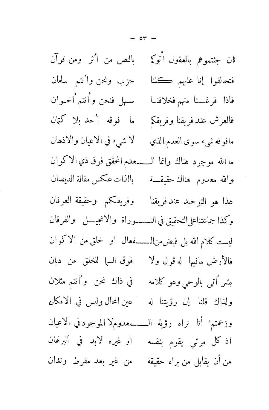 ولذاك قُلْنَا إِن رؤيتنا لَهُ عين الْمحَال وَلَيْسَ فِي الامكان ... وزعمتم انا نرَاهُ رُؤْيَة الْمَعْدُوم لَا الْمَوْجُود فِي الاعيان