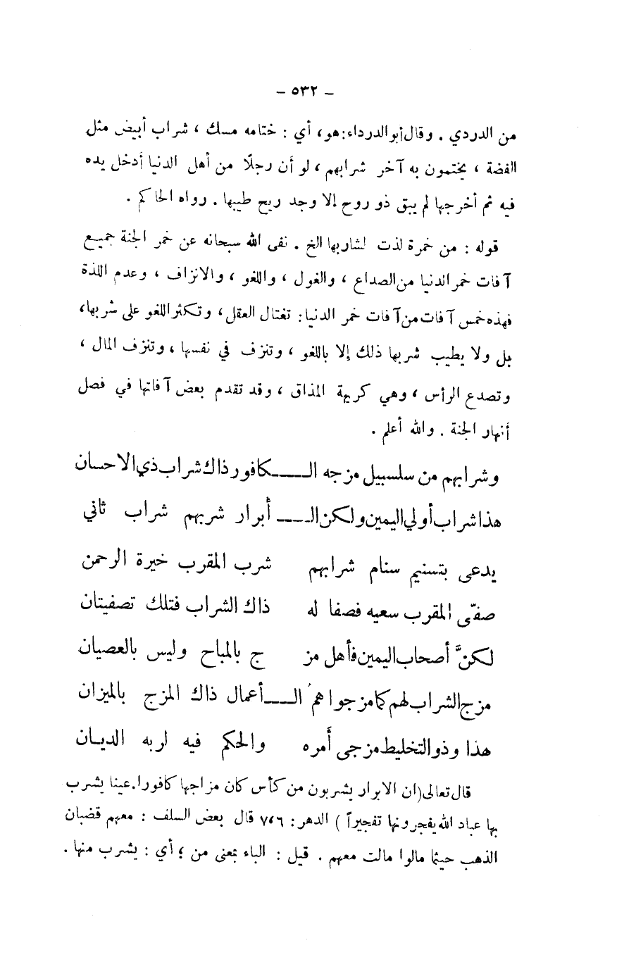 هَذَا شراب أولي الْيَمين وَلَكِن الْأَبْرَار شربهم شراب ثَانِي ... يدعى بتسنيم سَنَام شرابهم ... شرب المقرب خيرة الرَّحْمَن ... صفى المقرب سَعْيه فصفا لَهُ ... ذَاك الشَّرَاب فَتلك تصفيتان