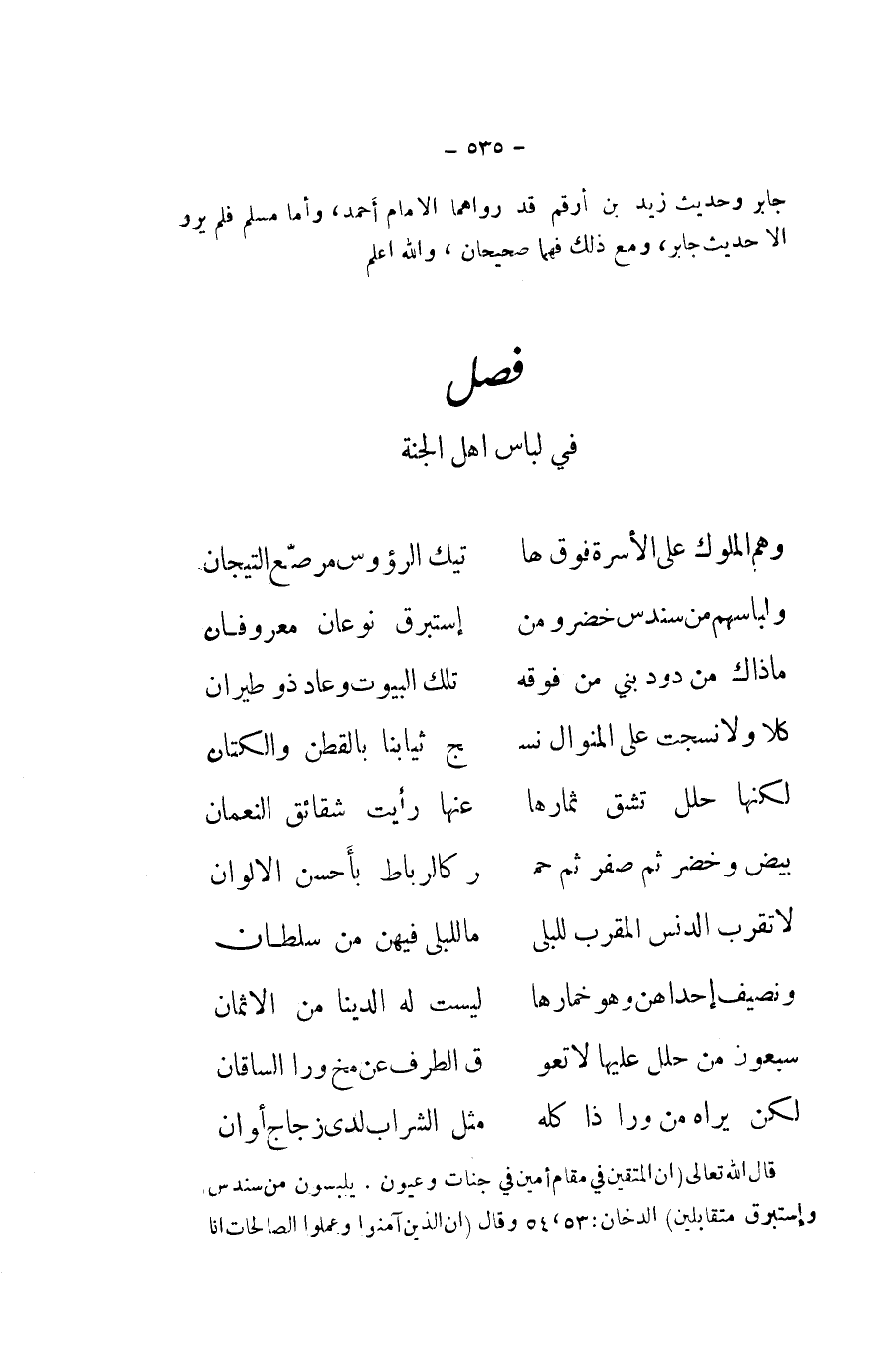 فِي لِبَاس أهل الْجنَّة ... وهم الْمُلُوك على الأسرة فَوق هَا ... تيك الرؤوس مرصع التيجان