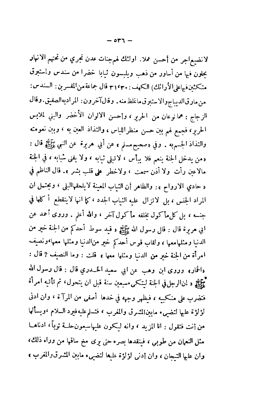 الْكَهْف قَالَ جمَاعَة من الْمُفَسّرين السندس من مارق الديباج والاستبرق مَا غلظ مِنْهُ وَقَالَ آخَرُونَ المُرَاد بِهِ الصفيق وَقَالَ الزّجاج هما نَوْعَانِ من الْحَرِير وَأحسن الألوان الْأَخْضَر والبني لملابس الْحَرِير فَجمع لَهُم بَين حسن منظر اللبَاس والتذاذ الْعين بِهِ وَبَين نعومته والتذاذ الْجِسْم بِهِ وَفِي صَحِيح مُسلم عَن أبي هُرَيْرَة عَن النَّبِي صلى الله عَلَيْهِ وَسلم قَالَ من يدْخل الْجنَّة ينعم فَلَا يبأس لَا تبلى ثِيَابه وَلَا يفنى شبابه فِي الْجنَّة مَا لَا عين رَأَتْ وَلَا أذن سَمِعت وَلَا خطر على قلب بشر قَالَ النَّاظِم فِي حادي الارواح وَالظَّاهِر أَن الثِّيَاب الْمعينَة لَا يلْحقهَا البلى وَيحْتَمل أَن المُرَاد الْجِنْس بل لَا تزَال عَلَيْهِ الثِّيَاب الجدد كَمَا أَنَّهَا لَا يَنْقَطِع أكلهَا فِي جنسه بل كل مَأْكُول يخلفه مَأْكُول آخر وَالله أعلم وروى أَحْمد عَن ابي هُرَيْرَة قَالَ قَالَ رَسُول الله صلى الله عَلَيْهِ وَسلم قيد سَوط أحدكُم من الْجنَّة خير من الدُّنْيَا وَمثلهَا مَعهَا وَلَقَاب قَوس أحدكُم خير من الدُّنْيَا وَمثلهَا مَعهَا ونصيف امْرَأَة من الْجنَّة خير من الدُّنْيَا وَمثلهَا مَعهَا قلت وَمَا النصيف قَالَ الْخمار وروى ابْن وهب عَن ابي سعيد الْخُدْرِيّ قَالَ قَالَ رَسُول الله صلى الله عَلَيْهِ وَسلم إِن الرجل فِي الْجنَّة ليتكىء سبعين سنة قبل أَن يتَحَوَّل ثمَّ نأتيه امْرَأَة فَتضْرب على مَنْكِبَيْه فَيظْهر وَجهه فِي خدها أصفى من الْمرْآة وان ادنى لؤلؤة عَلَيْهَا لتضىء مَا بَين الْمشرق وَالْمغْرب فتسلم عَلَيْهِ فَيرد السَّلَام ويسألها من أَنْت فَتَقول انا الْمَزِيد وانه ليَكُون عَلَيْهَا سَبْعُونَ حلَّة ثوبا ادناها مثل النُّعْمَان من طُوبَى فينقدها بَصَره حَتَّى يرى مخ سَاقهَا من وَرَاء ذَلِك وان عَلَيْهَا التيجان وان ادنى لؤلؤة عَلَيْهَا لتضىء مَا بَين الْمشرق وَالْمغْرب